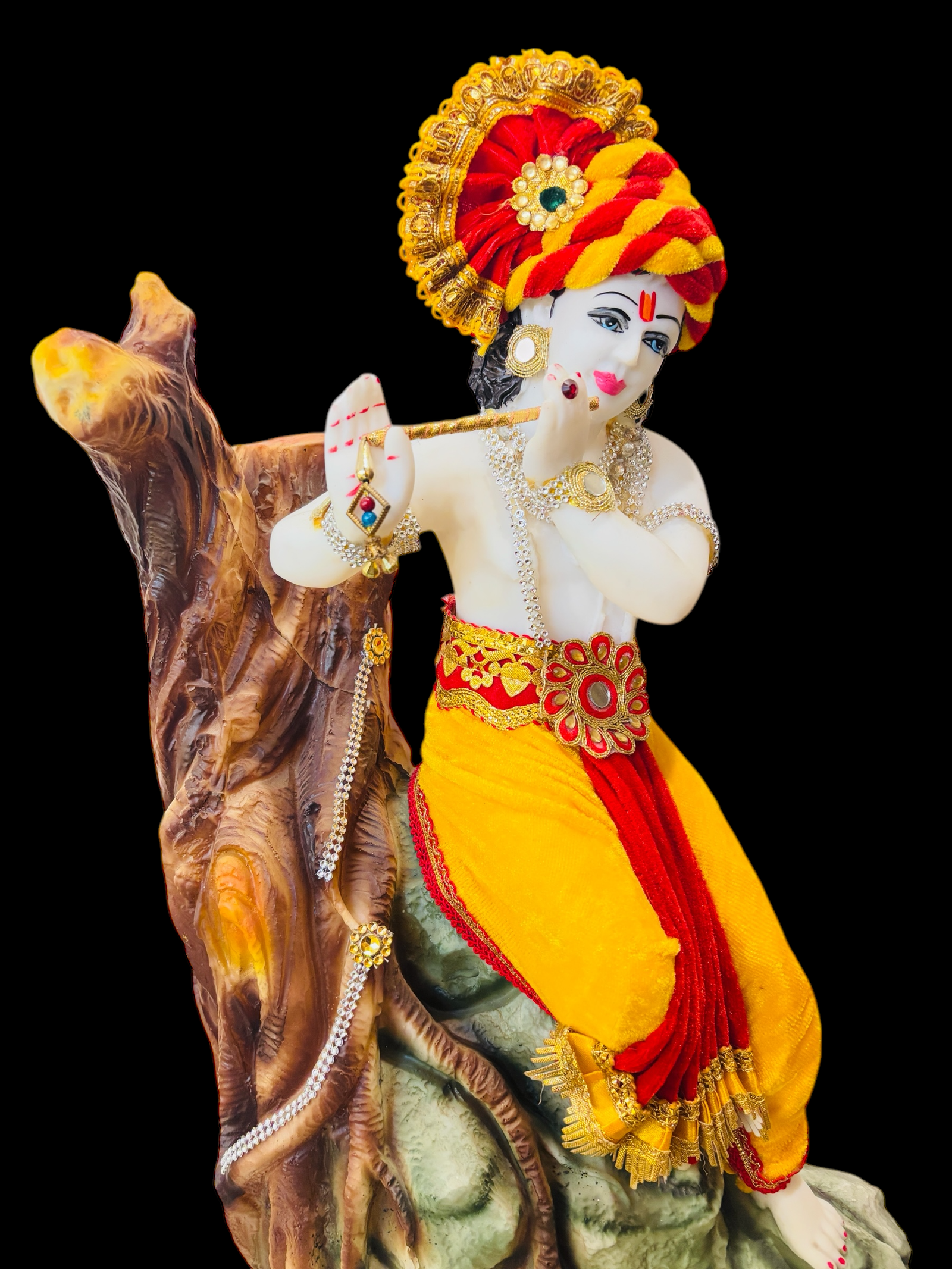 Lord Krishna seated on a tree stump while playing the flute. The tree stump base adds a natural touch, enhancing the storytelling aspect of this artistic piece.