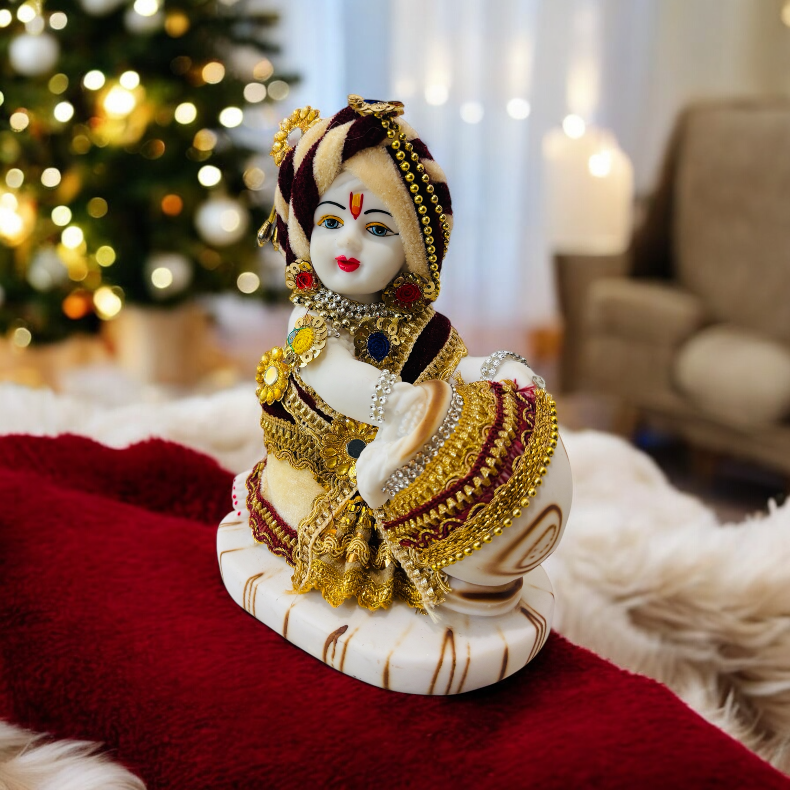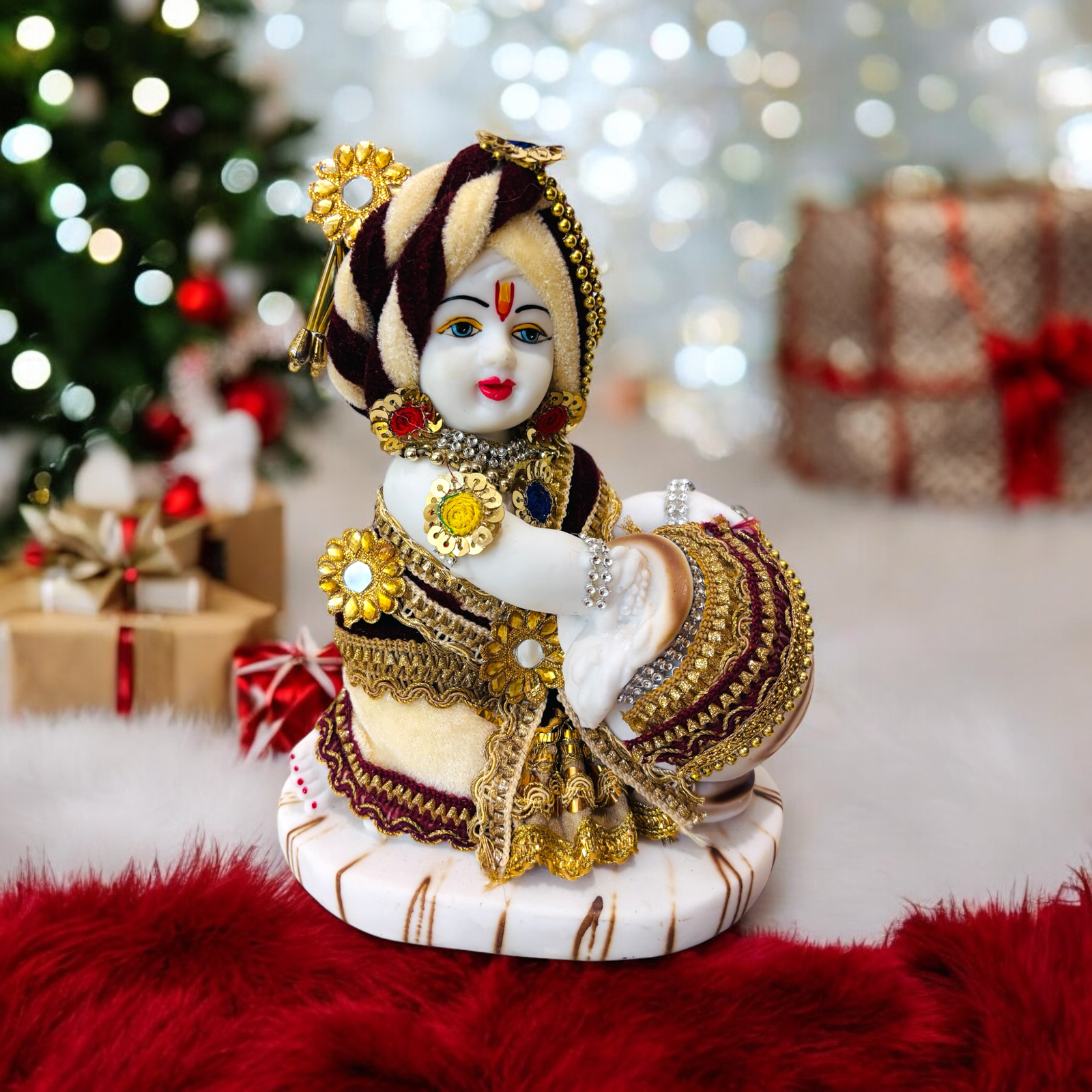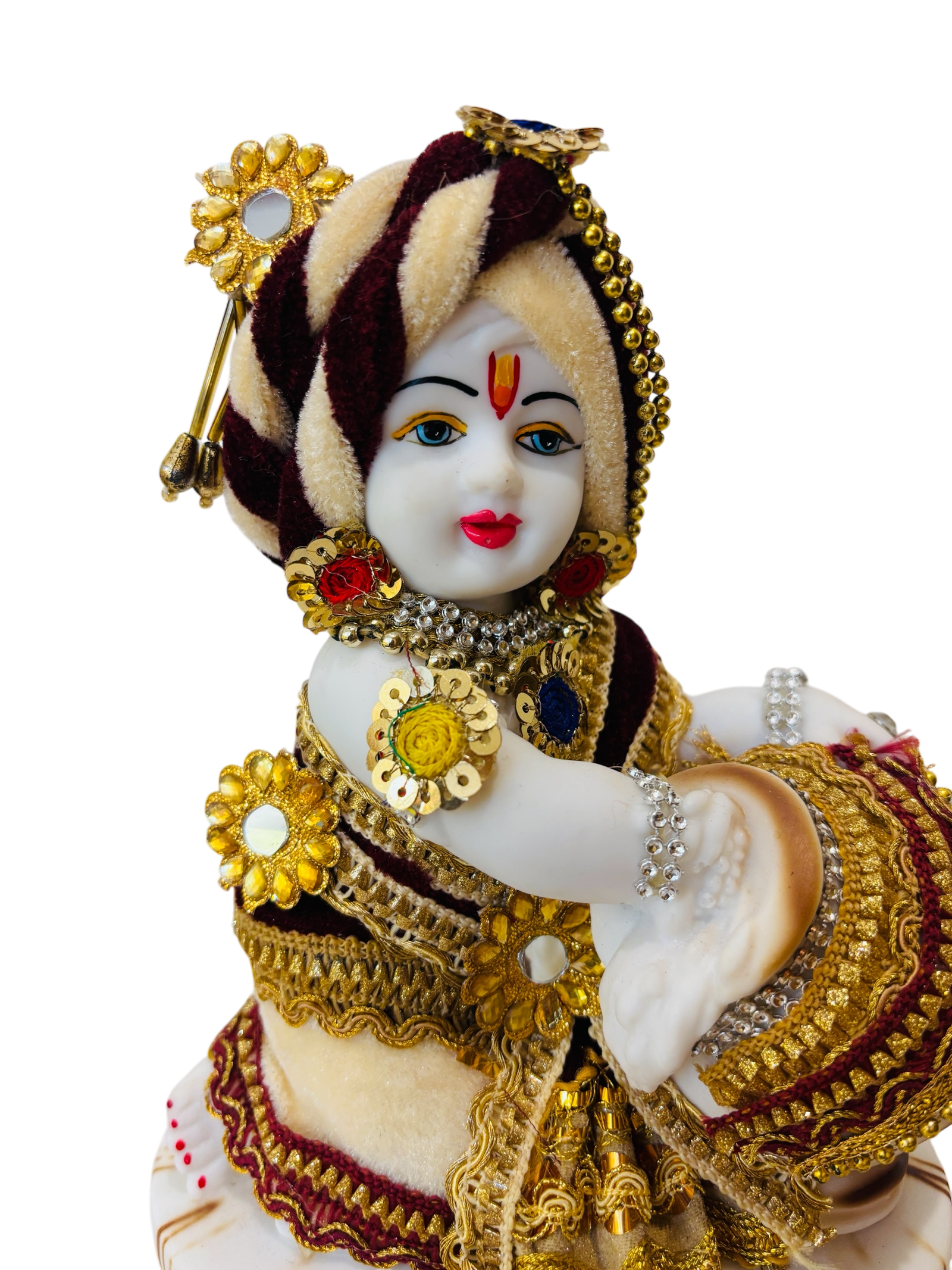 Lord Krishna in his child form, showing him in the playful act of churning butter, a scene often associated with “Makhan Chor” (butter thief) in Hindu tradition