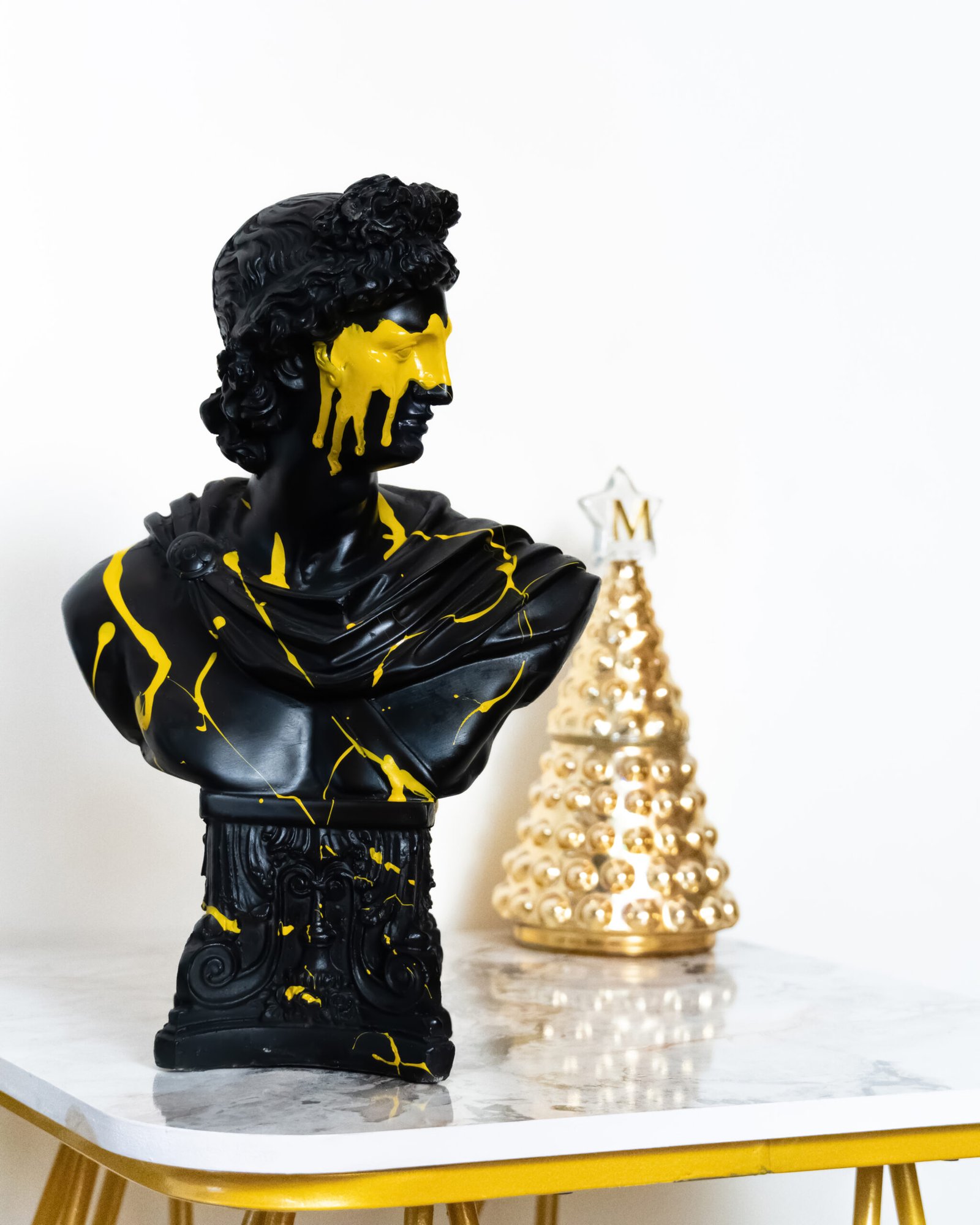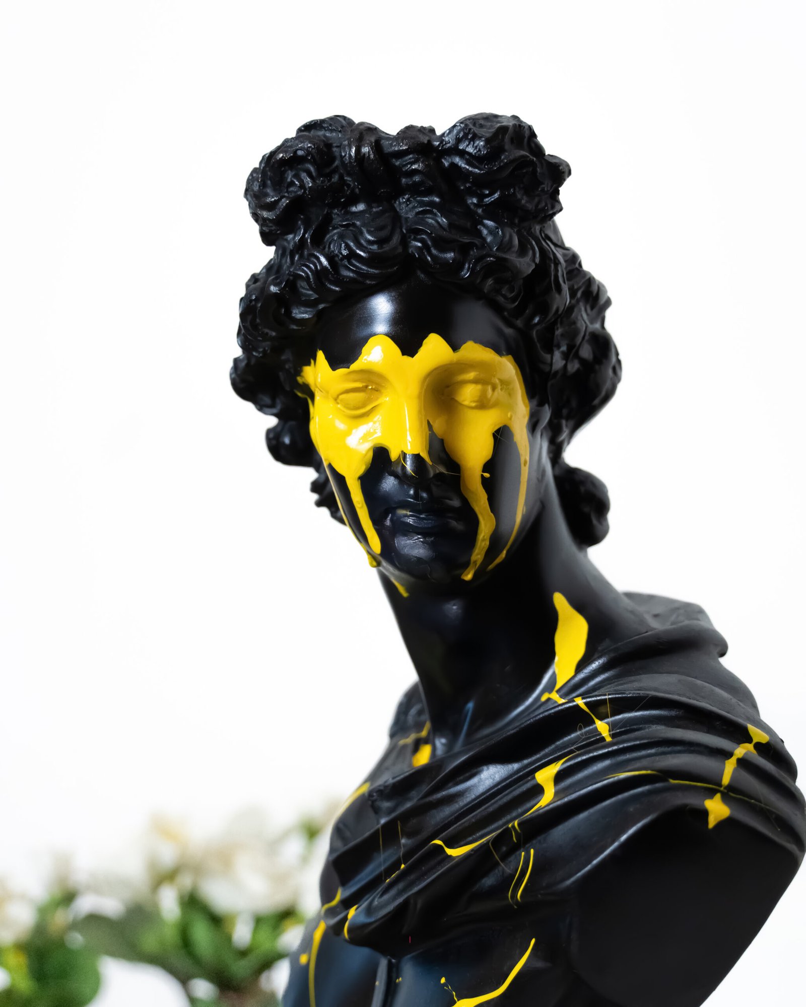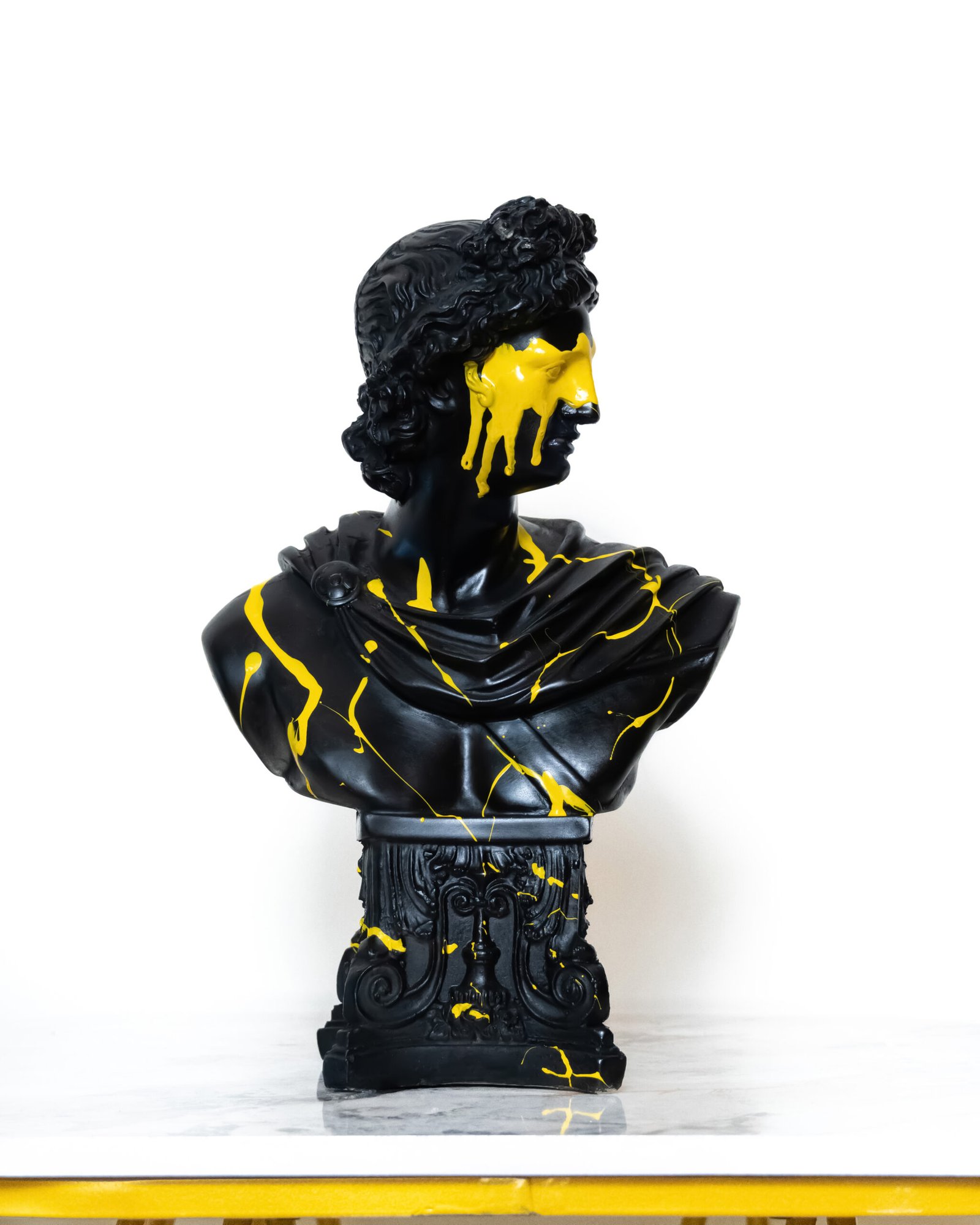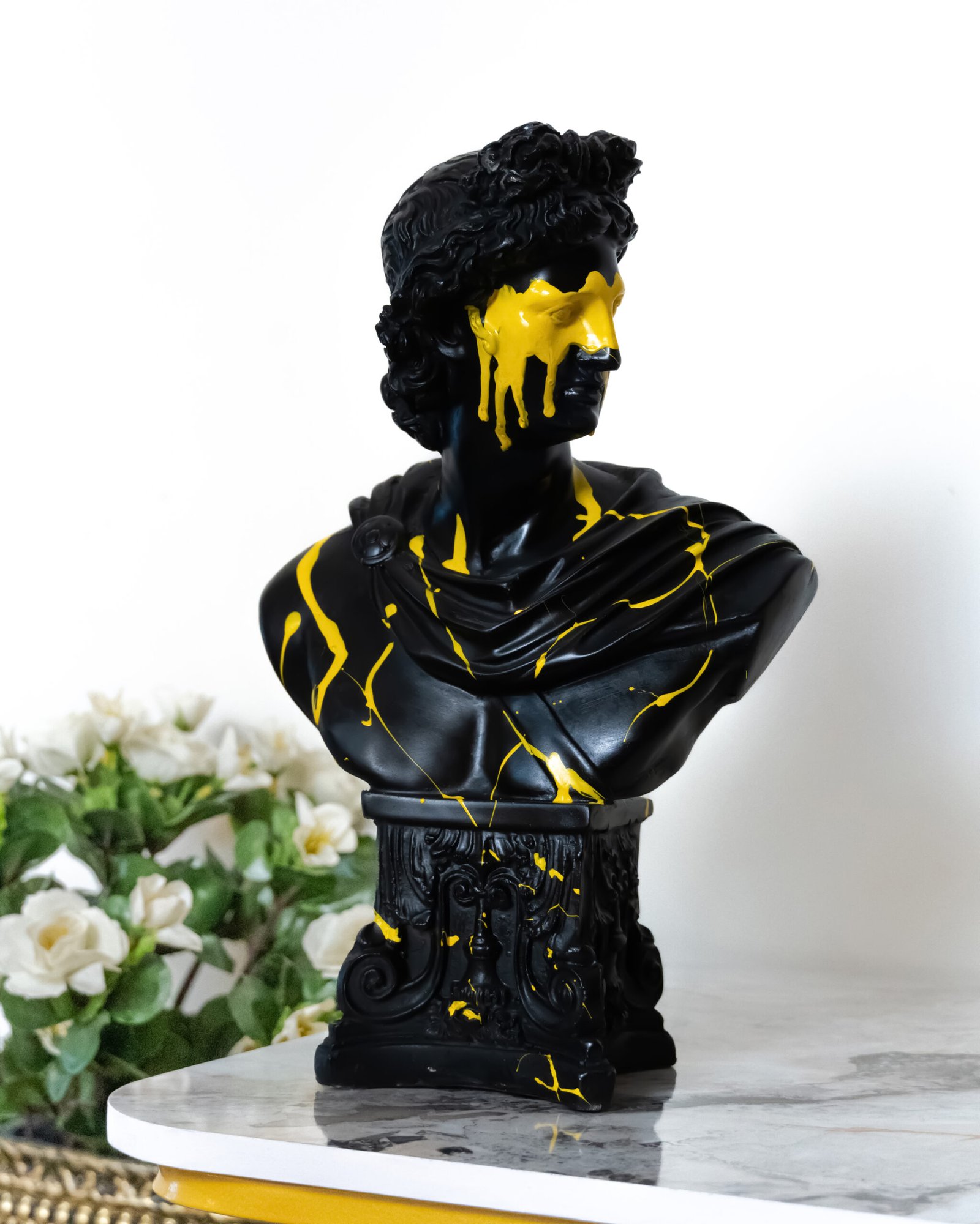 the replica features a black base with vibrant yellow paint splattered across the face and shoulders creating a striking contrast adding an abstract and contemporary flair to the roman tradition.