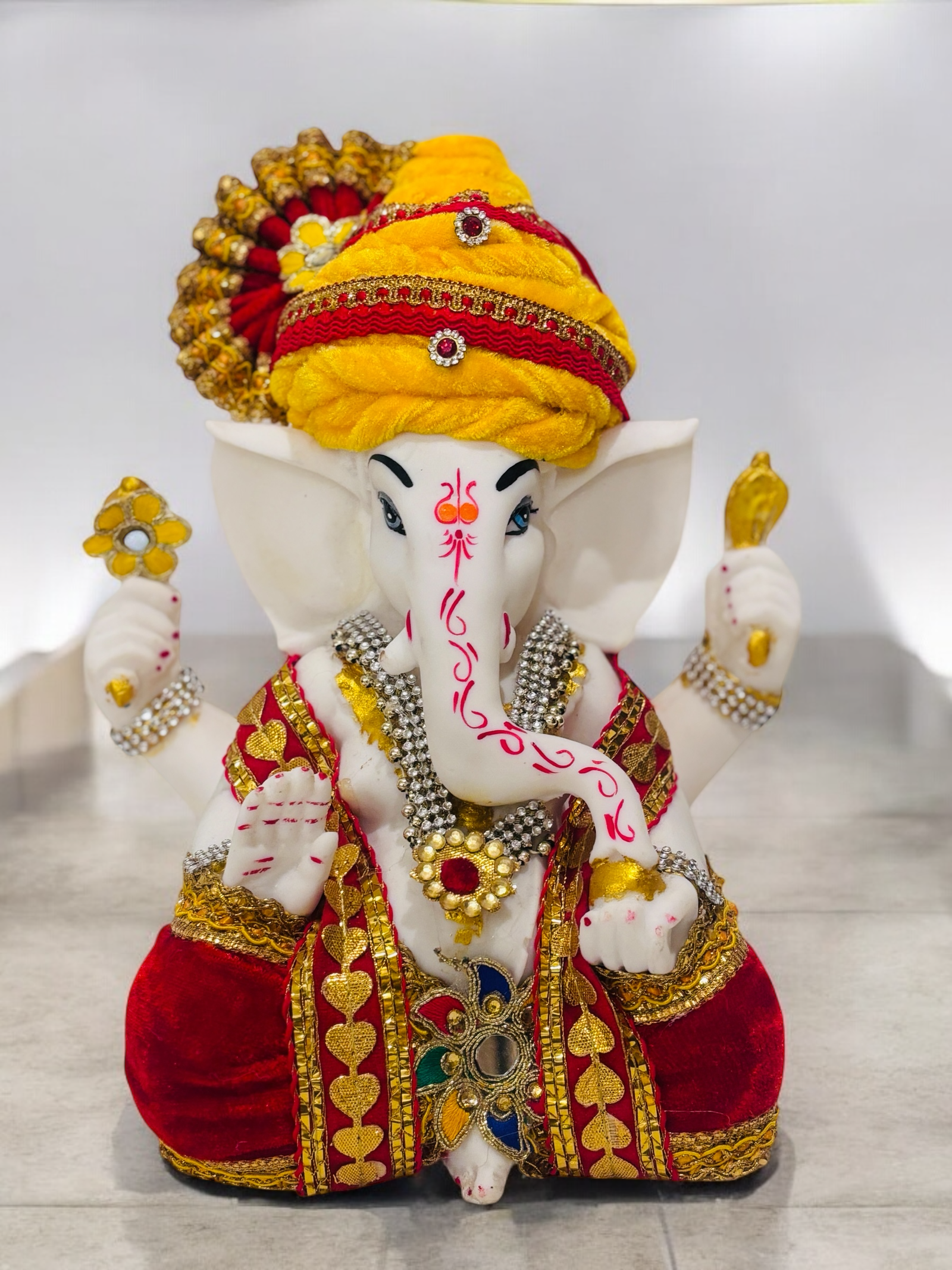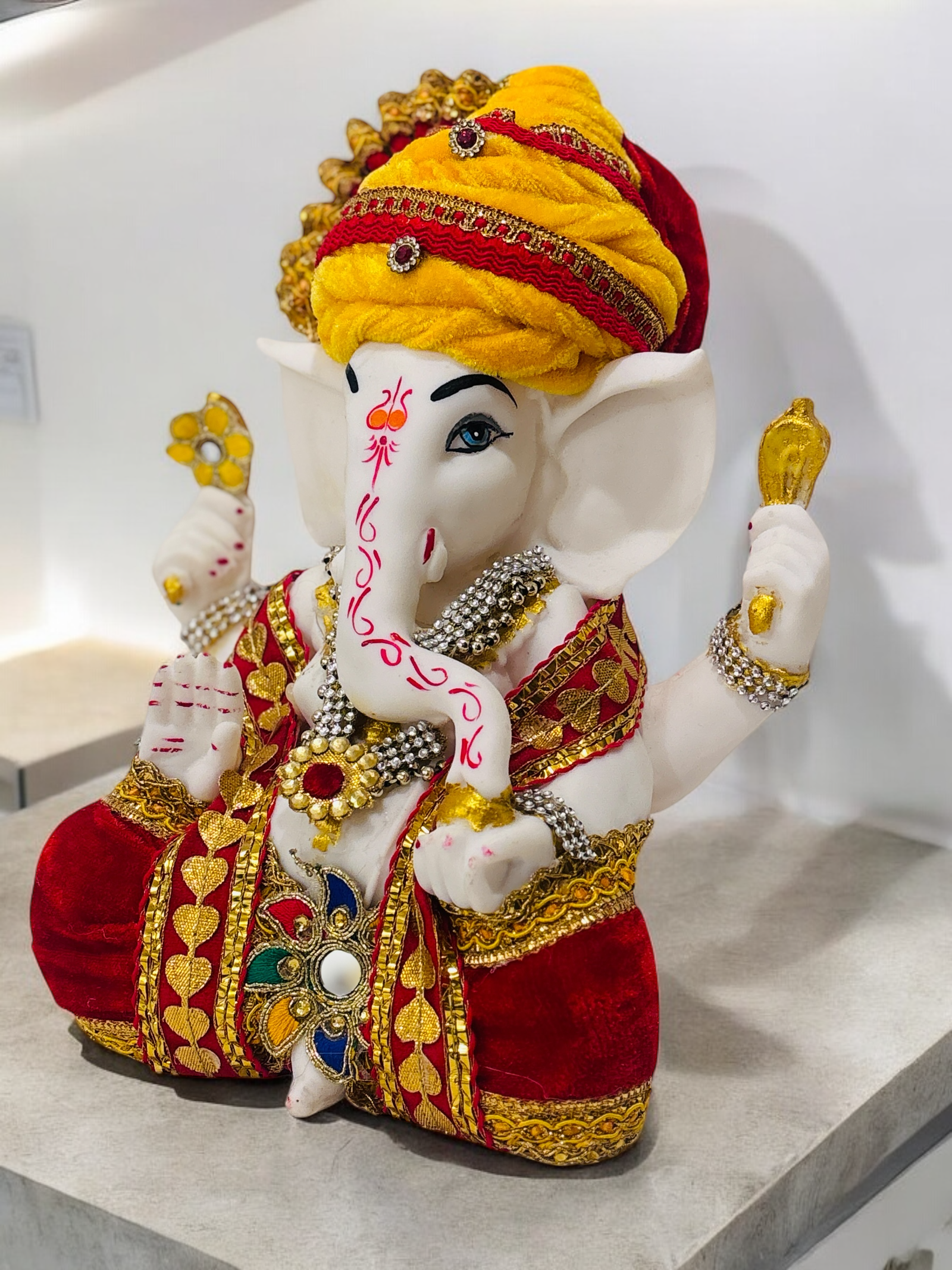This stunning statue of Lord Ganesha, showcasing a unique turban design, elegant attire, and intricate embellishments. It reflects devotion and artistic craftsmanship.