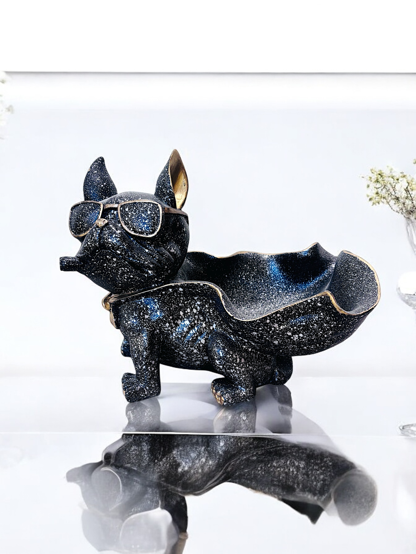 This is a decorative and functional bulldog sculpture, likely made of resin. It features a black bulldog wearing sunglasses and a cape, giving it a superhero-like appearance