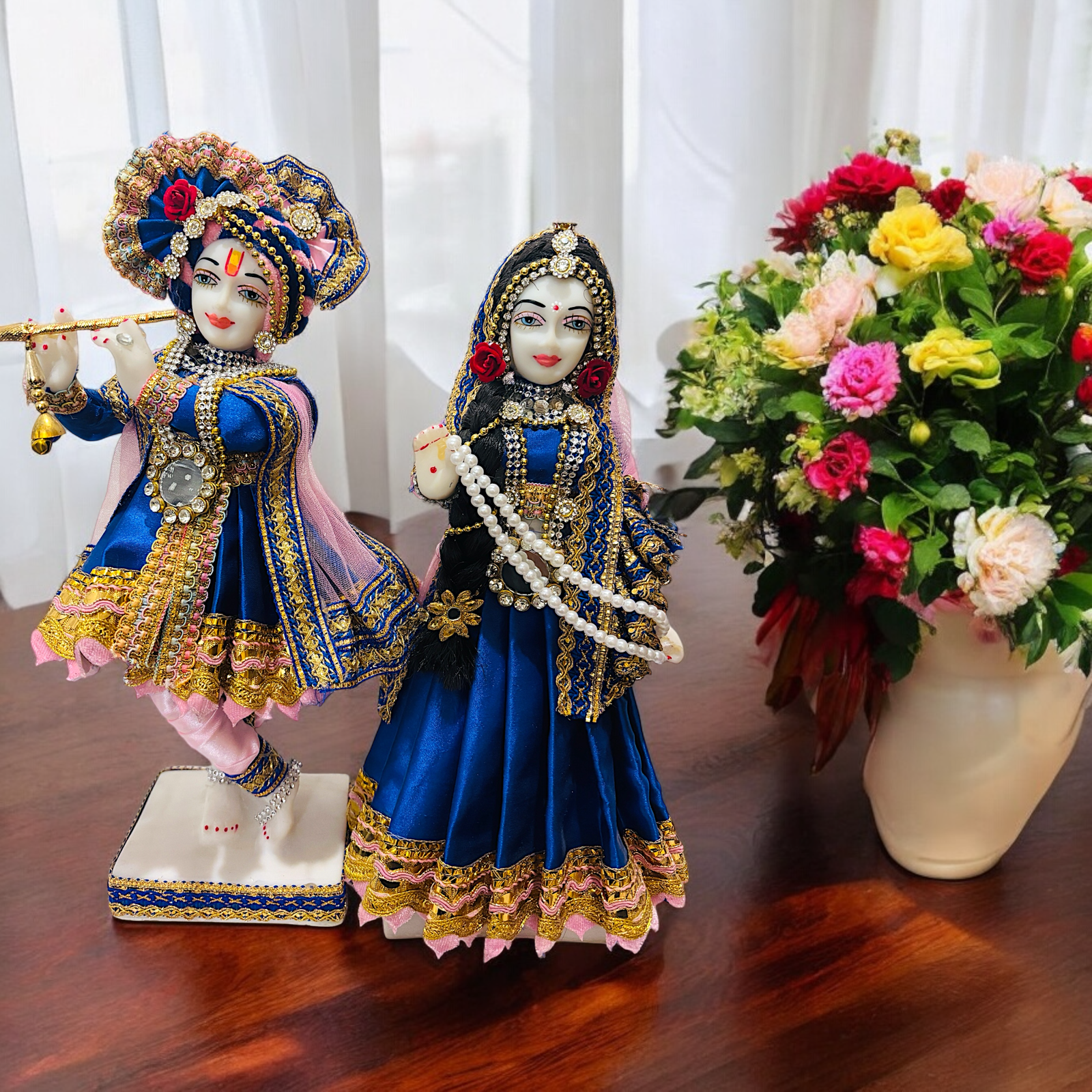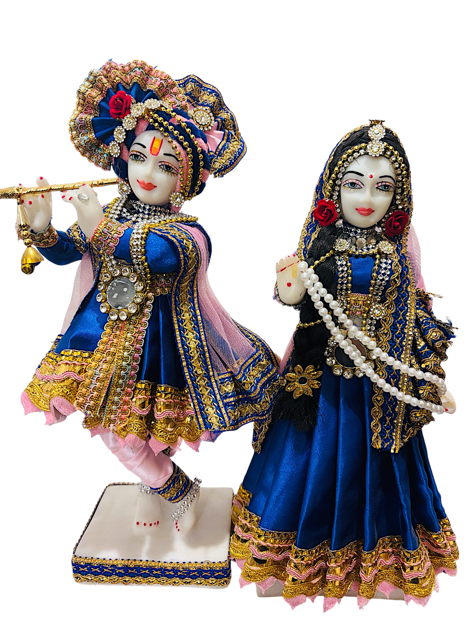 This is a captivating depiction of Radha and Krishna, exuding elegance and divinity. The intricate craftsmanship, vibrant colors, and graceful poses make this idol a stunning piece.The flute held by Krishna and Radha’s serene expression beautifully symbolize their divine love.