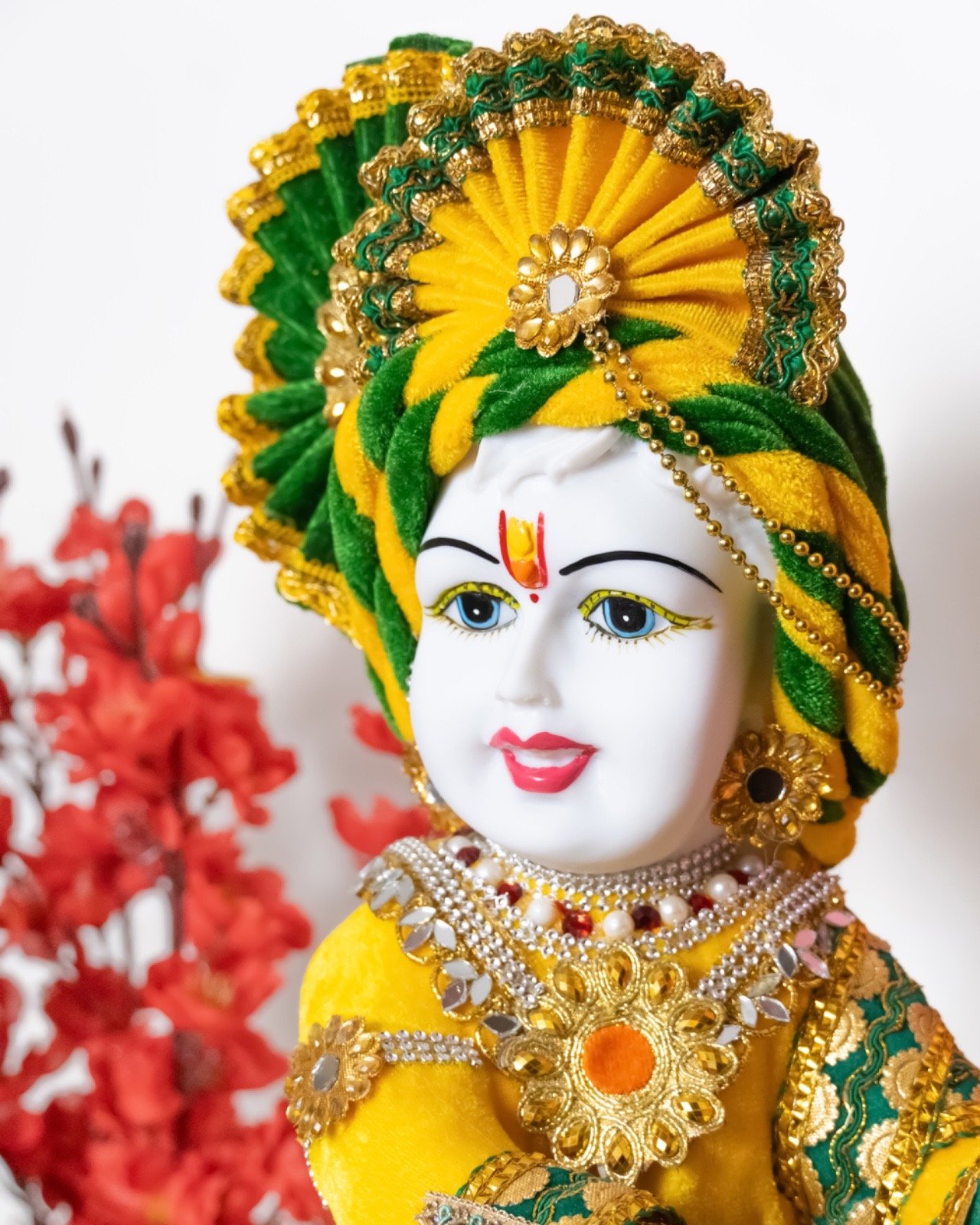 Lord Krishna seated on a tree stump while playing the flute. The tree stump base adds a natural touch, enhancing the storytelling aspect of this artistic piece.