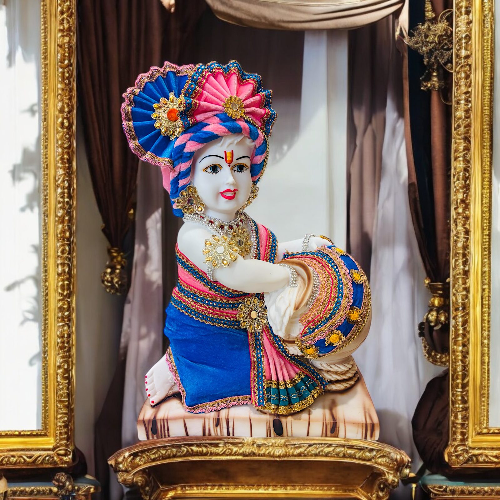 Lord Krishna in his child form, showing him in the playful act of churning butter, a scene often associated with “Makhan Chor” (butter thief) in Hindu tradition