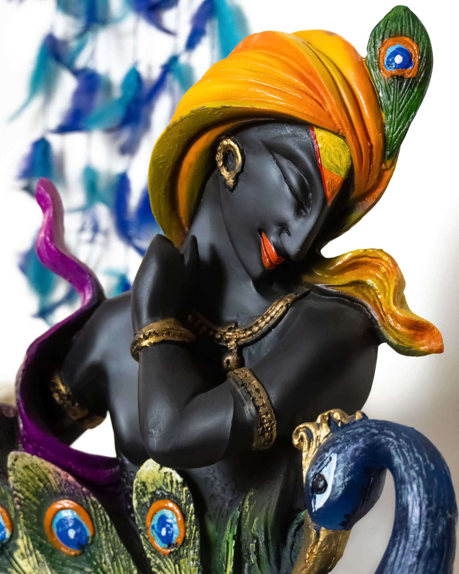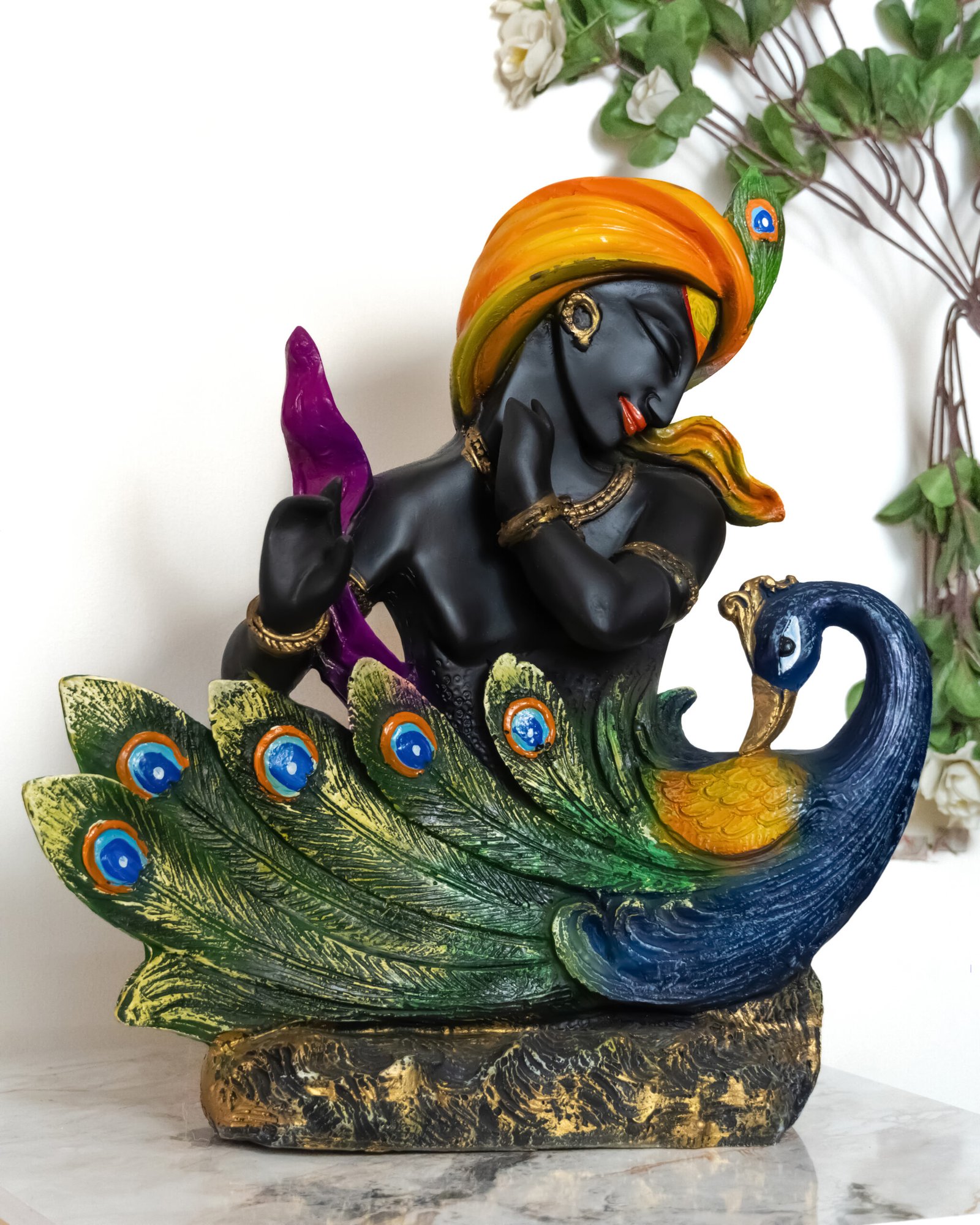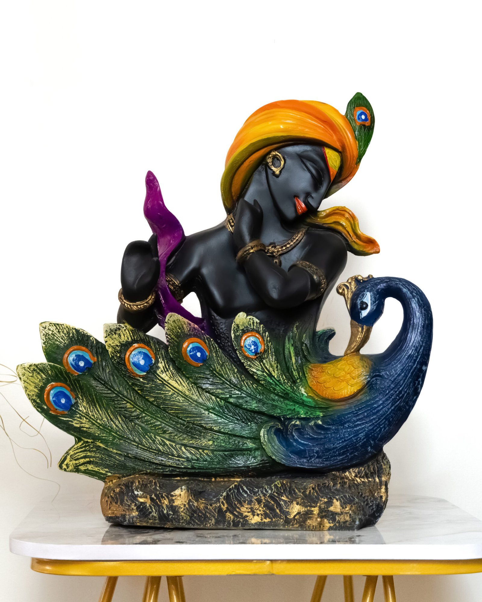 THIS IS A STATUE OF LORD KRISHNA A HINDU DEITY STANDING GRACEFULLY WITH A PEACOCK BY HIS SIDE HE IS DEPICTED PLAYING HIS FLUTE A SYMBOL OF THE DEVINE CONNECTION BETWEEN GOD AND HUMANITY