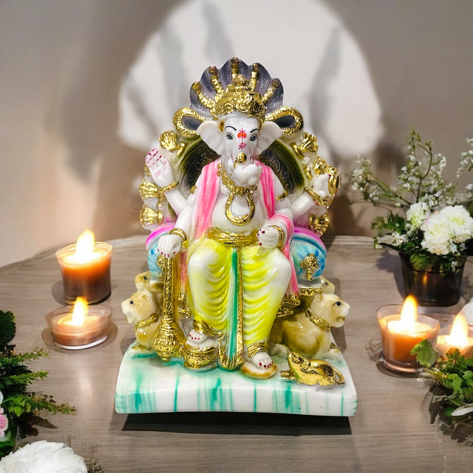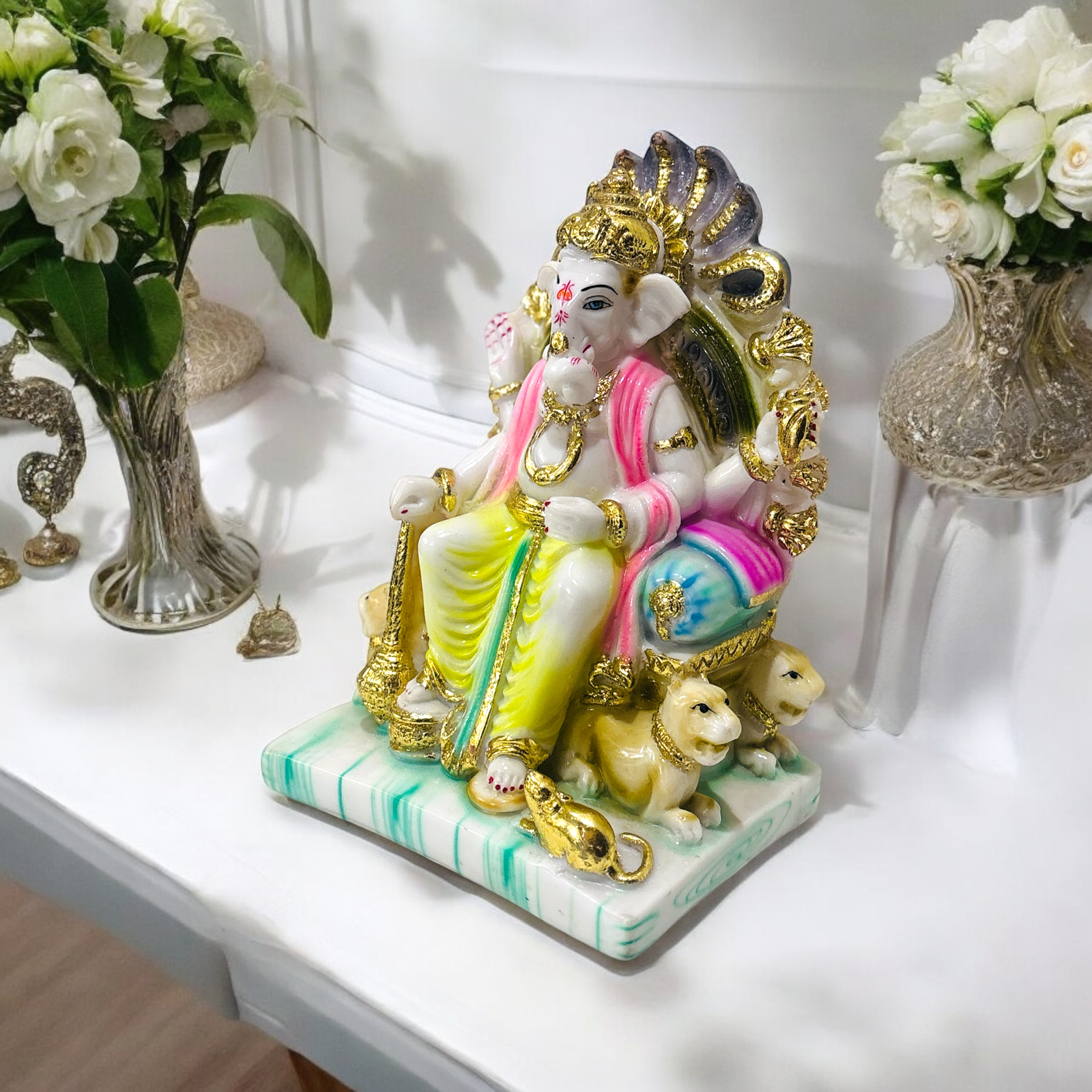 This statue of Lord Ganesha showcases him in a seated posture with vibrant colors and intricate detailing. Surrounded by symbolic elements such as the mouse and his divine aura,the idol exudes traditional artistry and spiritual elegance.