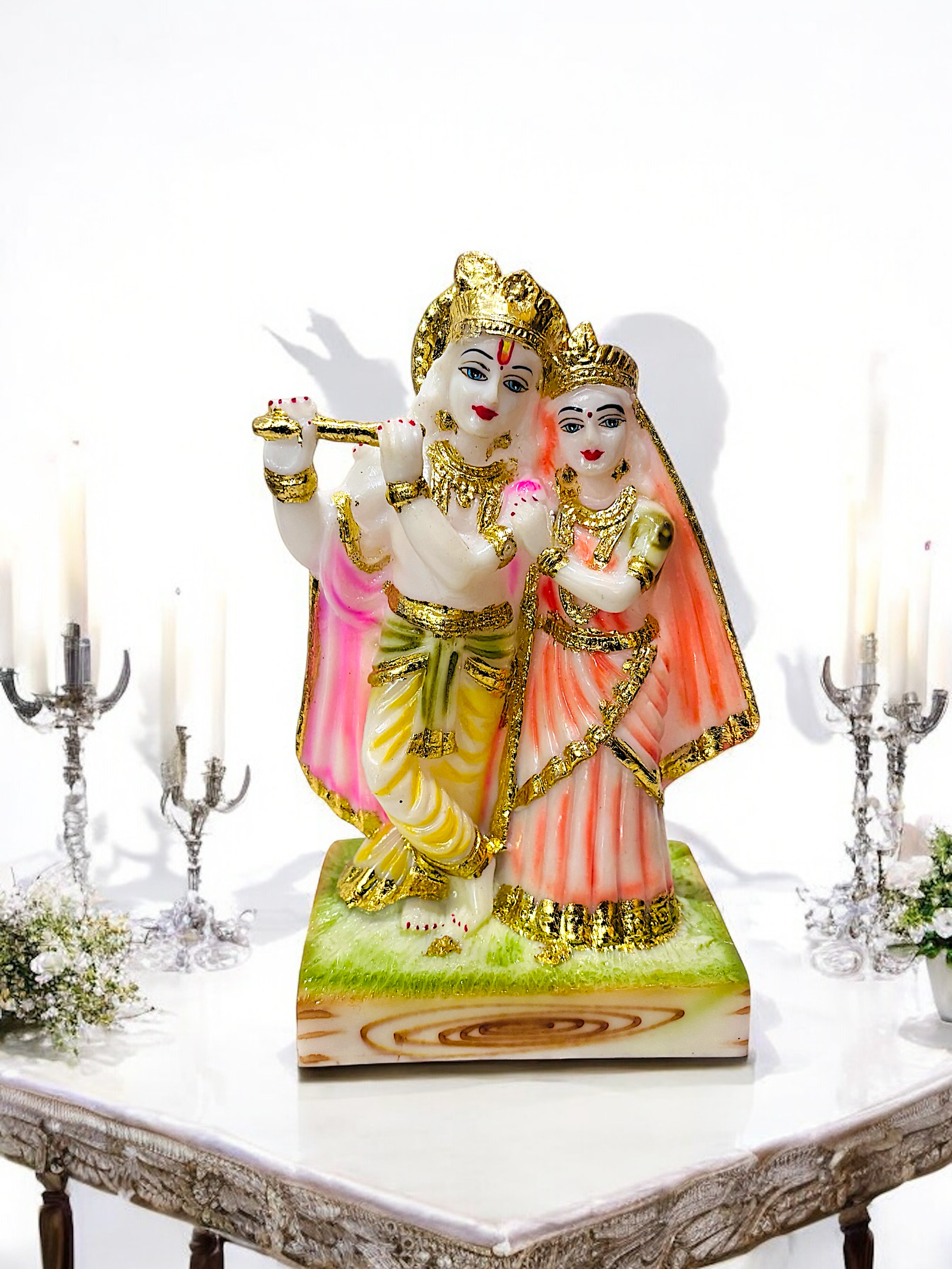 This is a captivating depiction of Radha and Krishna, exuding elegance and divinity. The intricate craftsmanship, vibrant colors, and graceful poses make this idol a stunning piece.The flute held by Krishna and Radha’s serene expression beautifully symbolize their divine love.