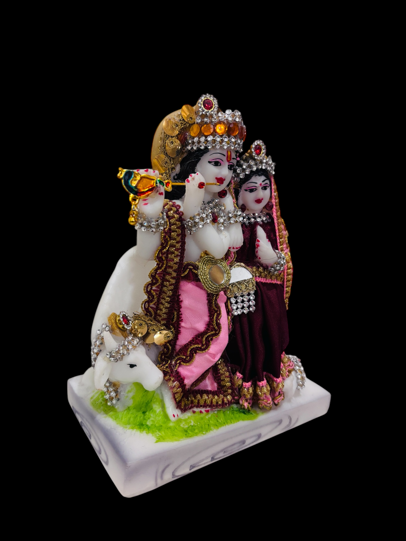 This is another beautifully crafted idol of Radha and Krishna, showcasing intricate designs and vibrant colors The presence of the cow in the background adds to the traditional symbolism, representing Krishna’s association with cows as Govinda.