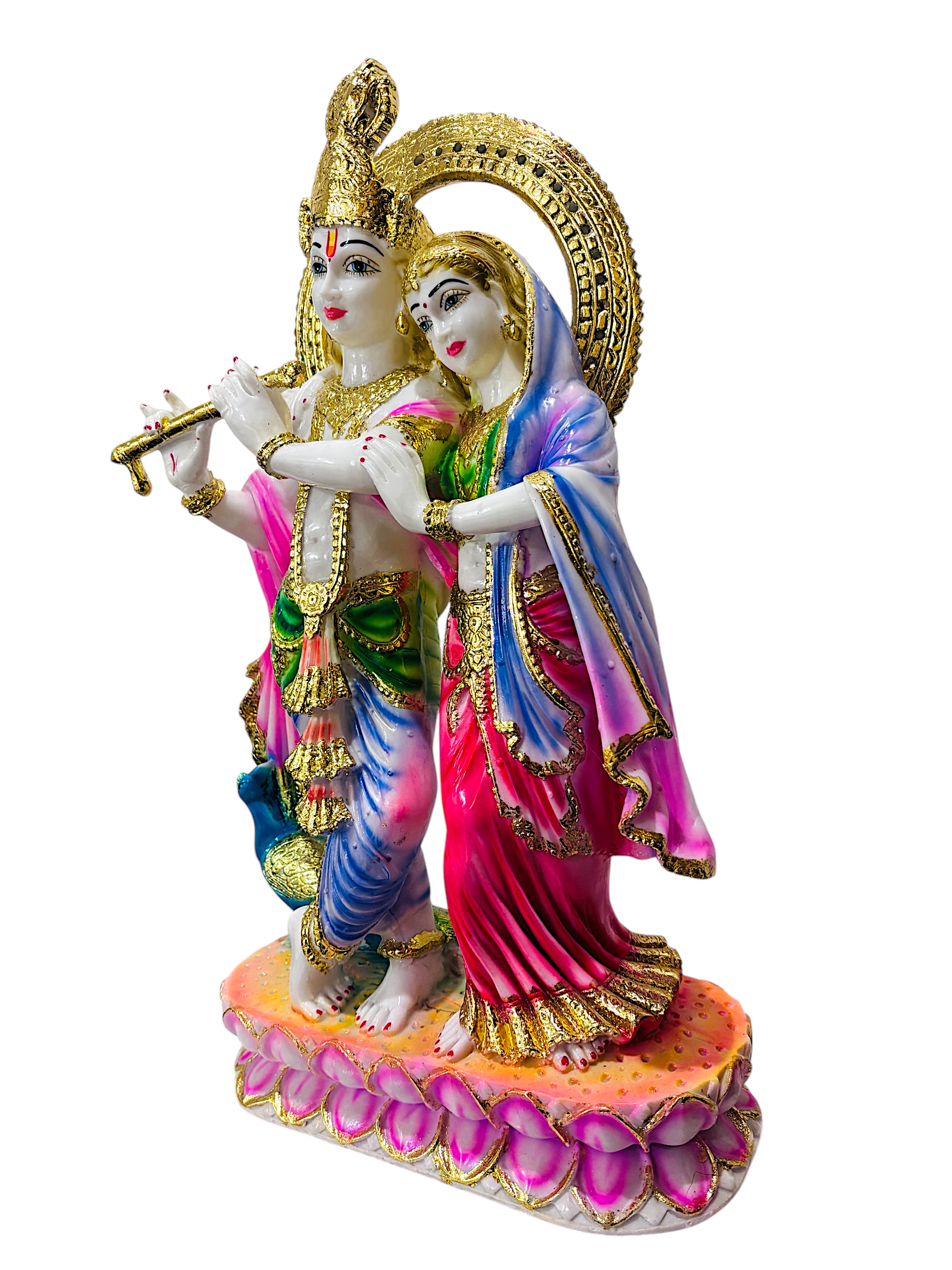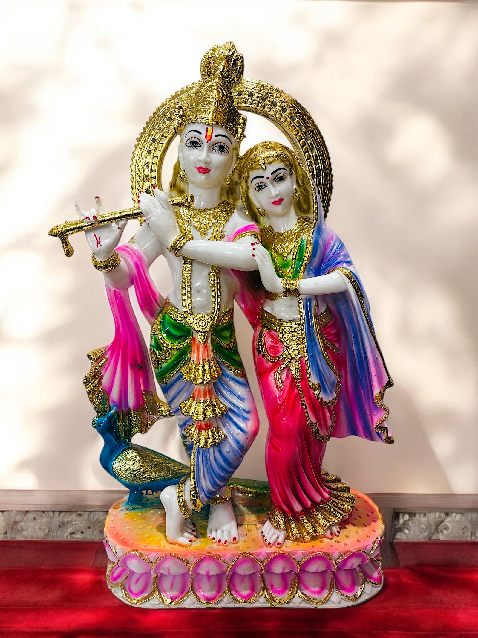 This is a captivating depiction of Radha and Krishna, exuding elegance and divinity. The intricate craftsmanship, vibrant colors, and graceful poses make this idol a stunning piece.The flute held by Krishna and Radha’s serene expression beautifully symbolize their divine love.