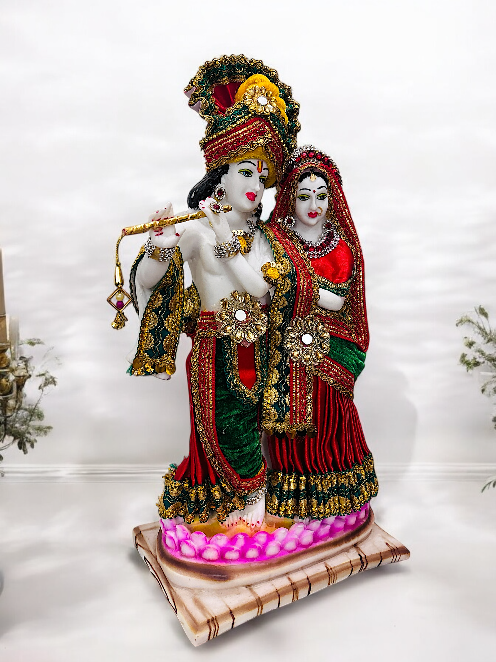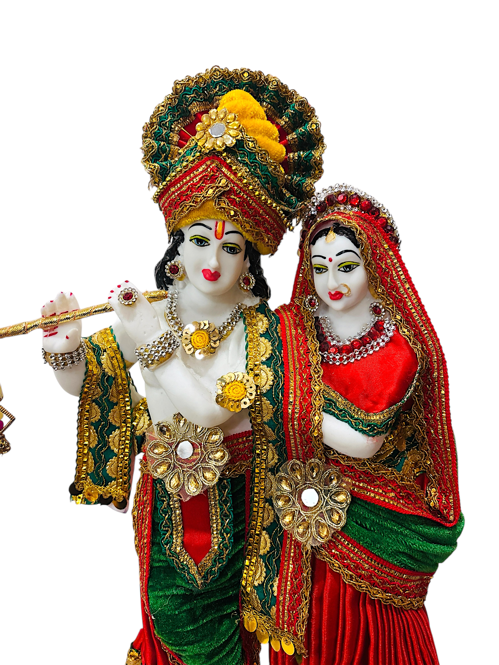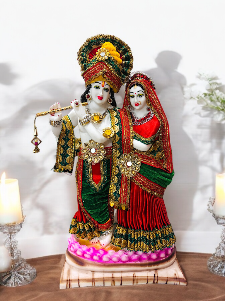 This is a captivating depiction of Radha and Krishna, exuding elegance and divinity. The intricate craftsmanship, vibrant colors, and graceful poses make this idol a stunning piece.The flute held by Krishna and Radha’s serene expression beautifully symbolize their divine love.