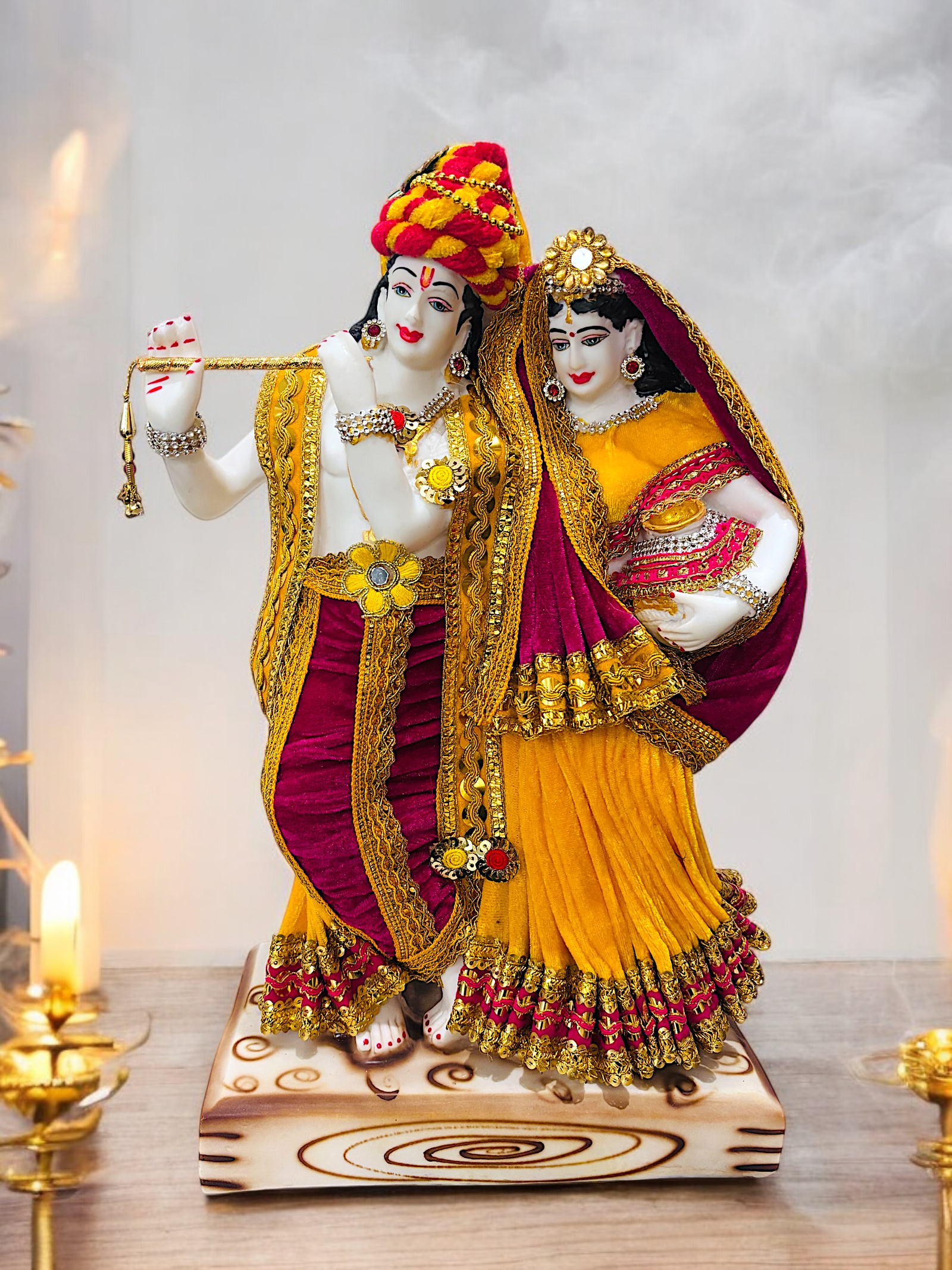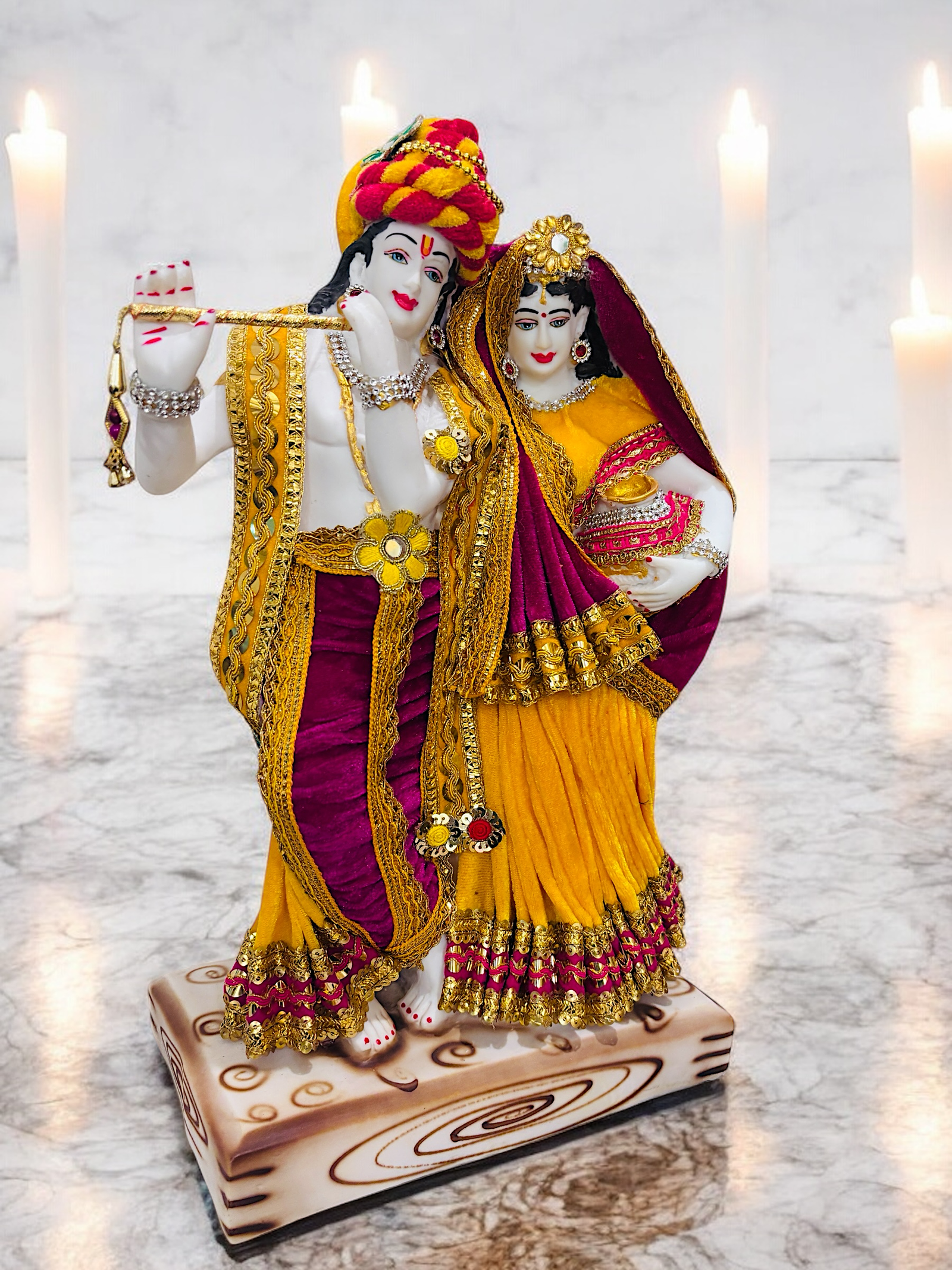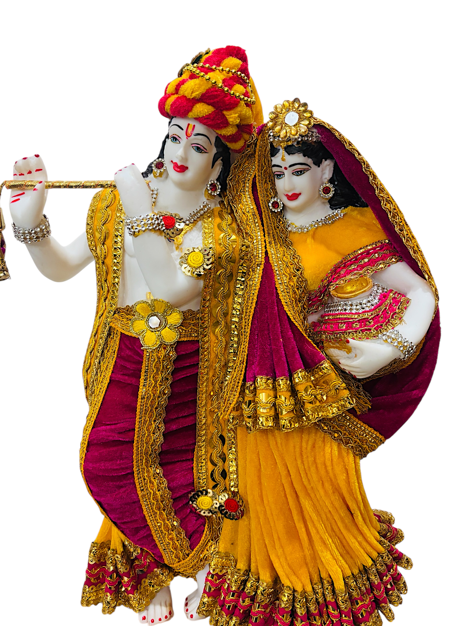 owr colorful and mesmerising statue of radha krishna.krishna is playing flute while radha standing beside is holding her matki.