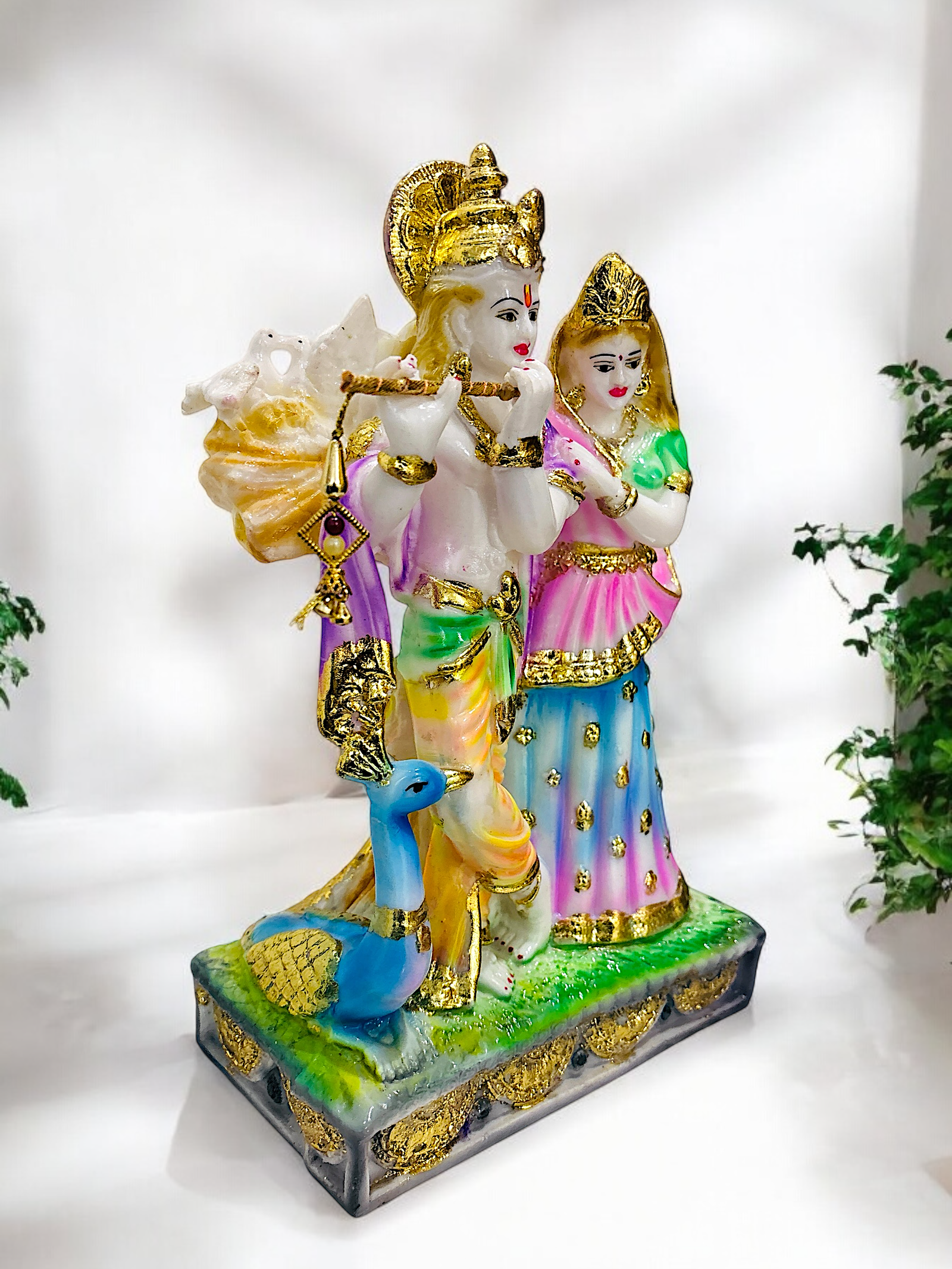 the white mesmerising statue of radha krishna,the devine couple in hinduism.krishna is depicyed playing with flute while radha stands beside him
