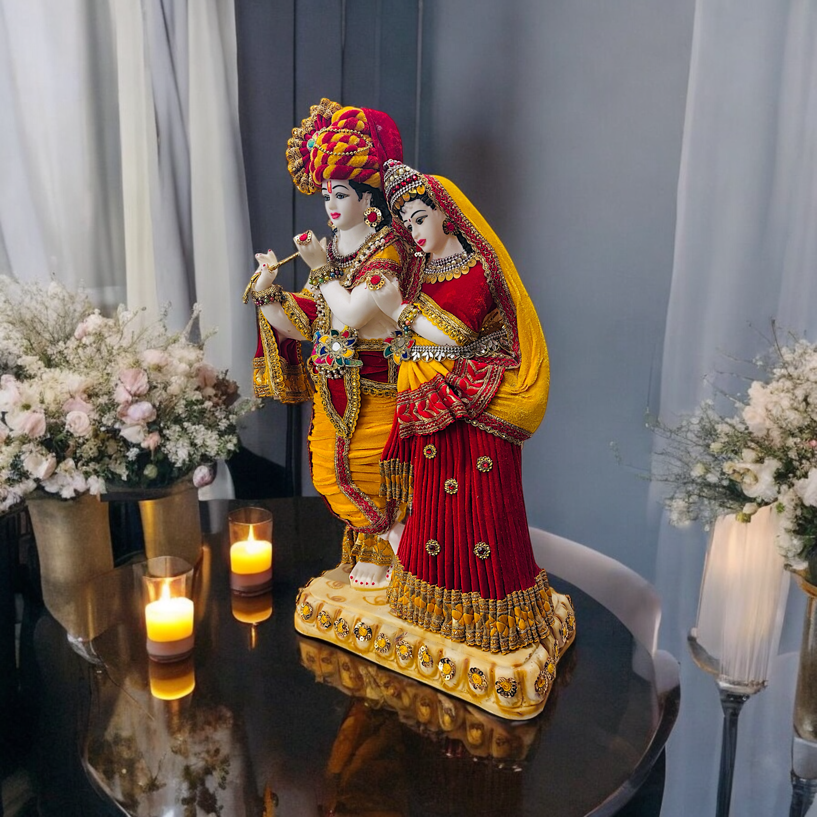The standing Radha Krishna marble idol is one of the most admired idols. Devotee keep this Radha krishna idol at living room or at office for devine blessings.According to scriptures Radha is acknowledged as the Supreme Goddess. Scholars believe that Krishna pleases with devotional service in loving servitude.and Radha is the personification of devotional service to the supreme lord.
