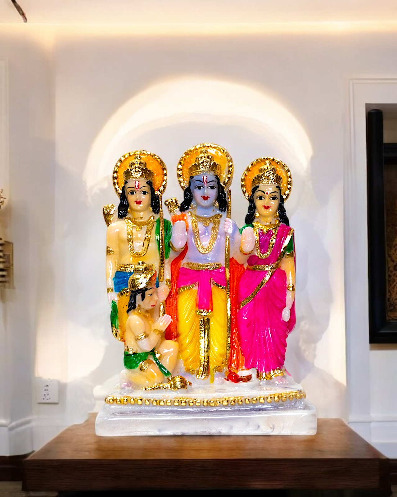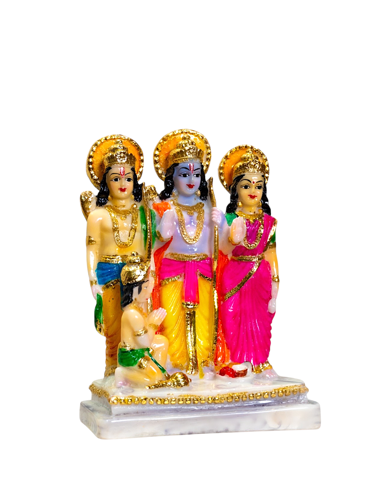 This statue depicts the Hindu deity Ram Darbar, a group of figures including Lord Rama, his wife Sita, his brother Lakshman, and his devotee Hanuman.