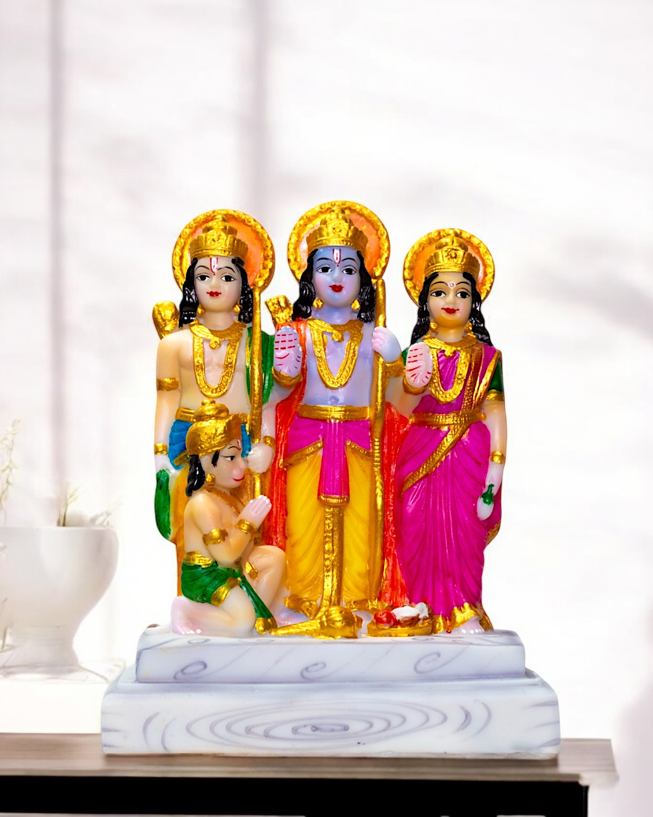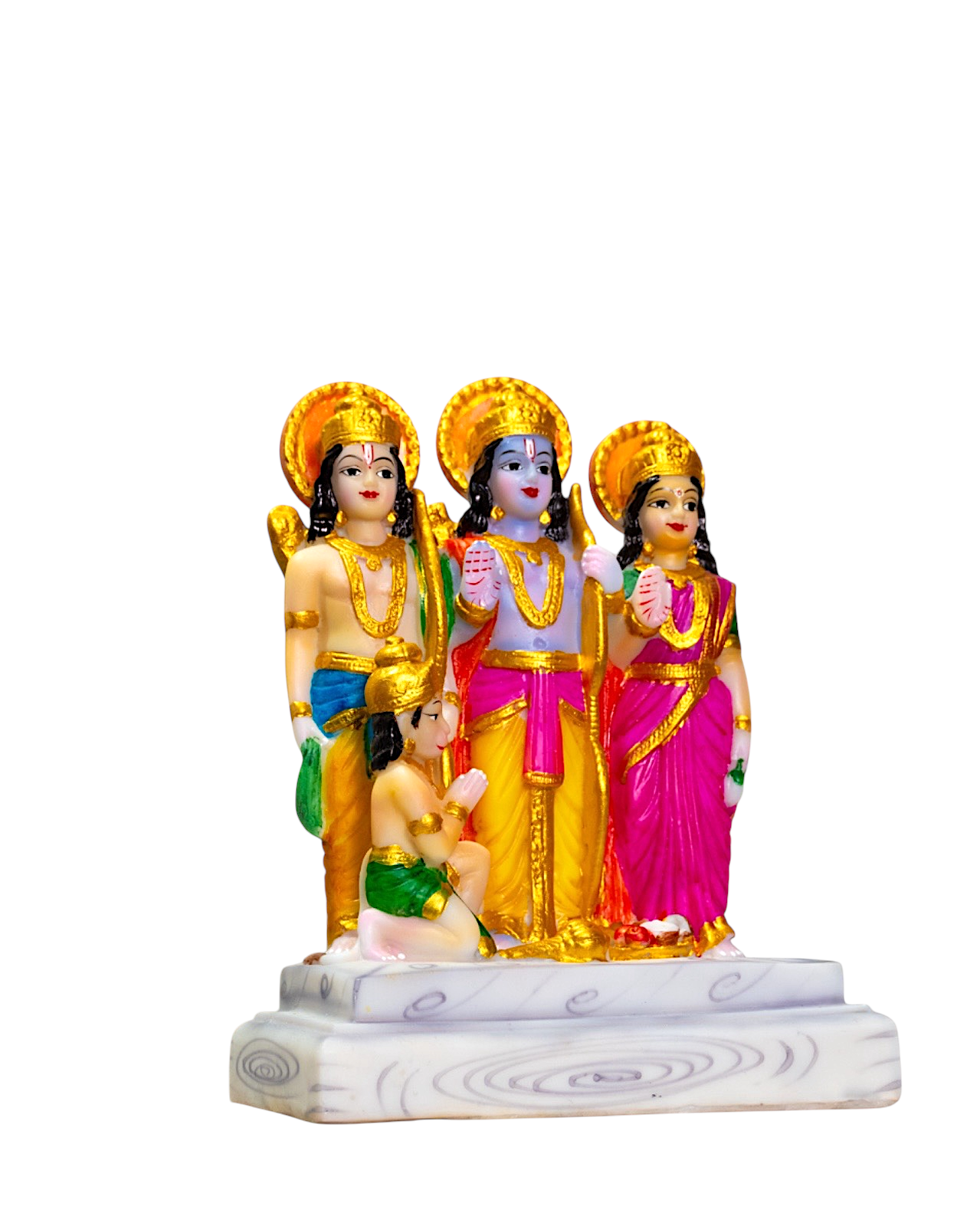 This statue depicts the Hindu deity Ram Darbar, a group of figures including Lord Rama, his wife Sita, his brother Lakshman, and his devotee Hanuman.