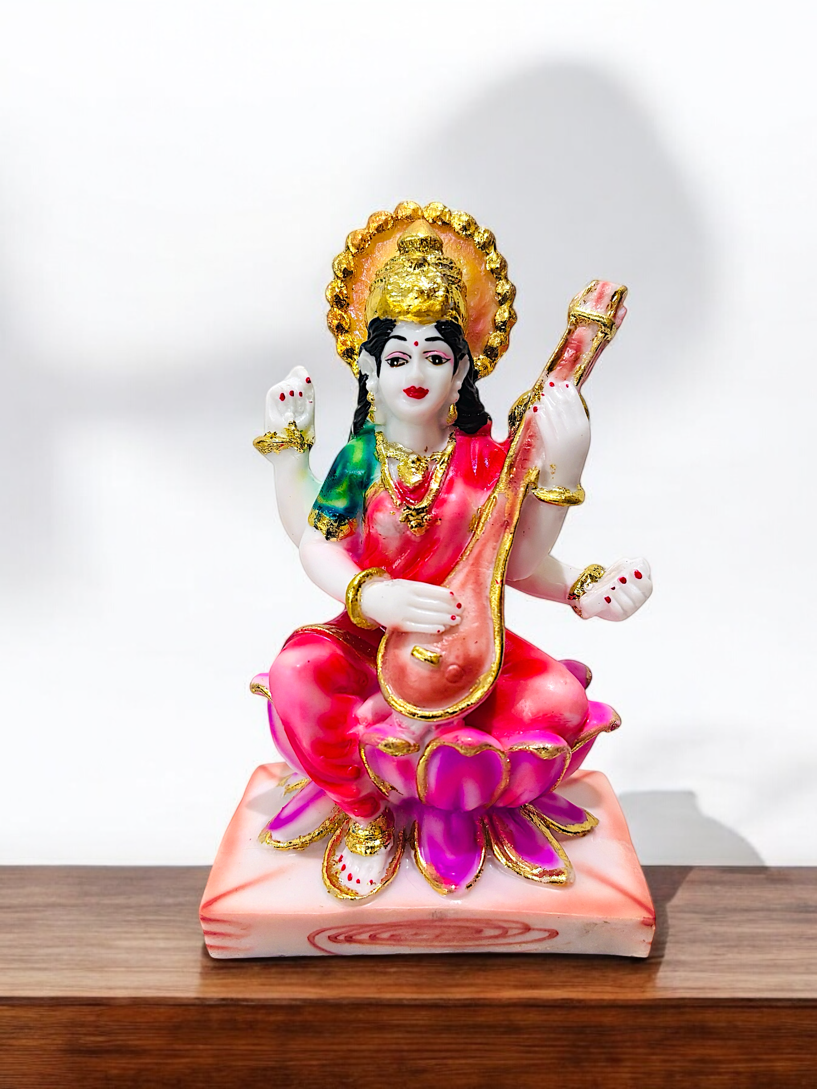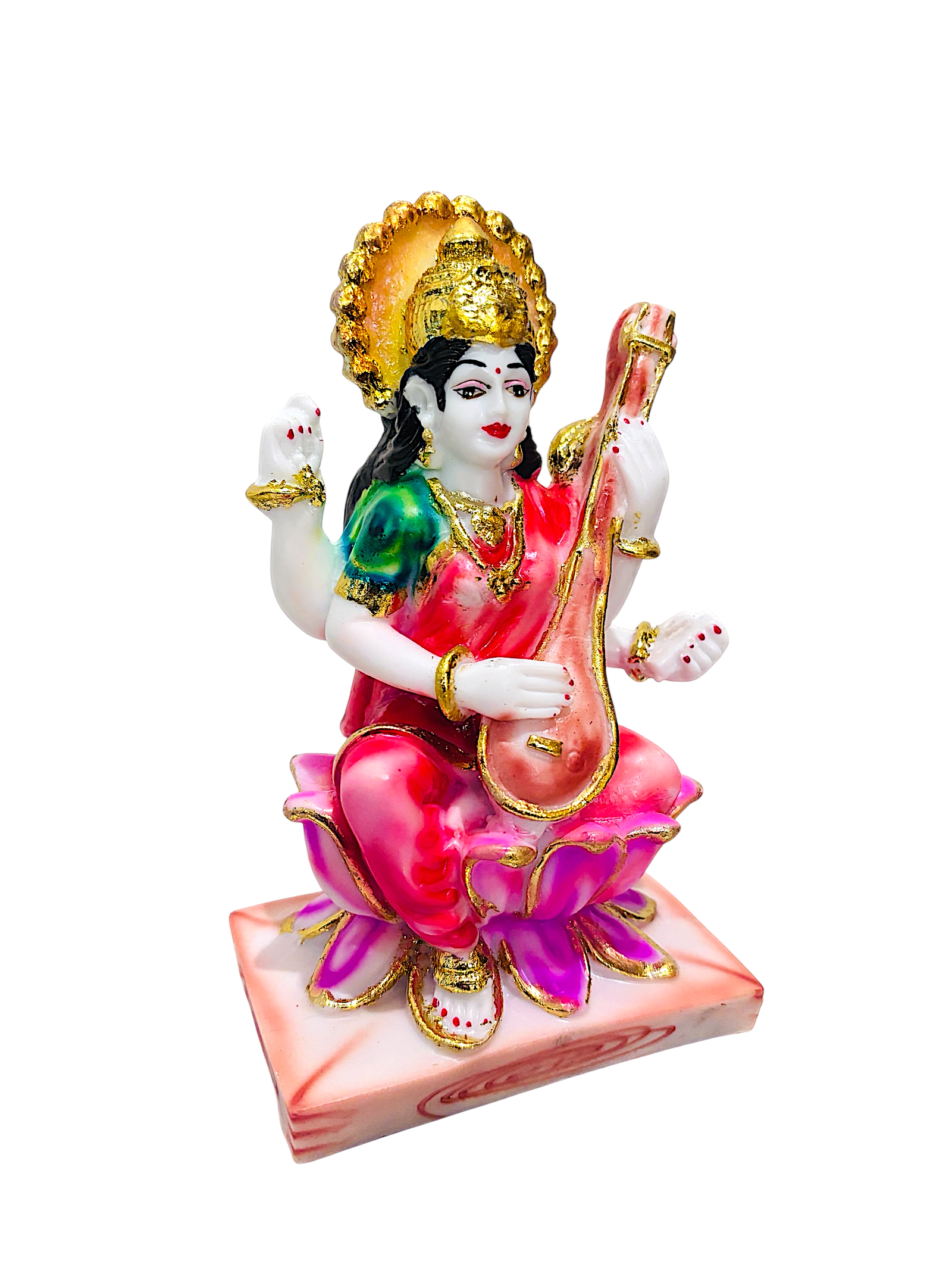 “Saraswati, the goddess of knowledge and arts.She is often depicted with a veena (a musical instrument) and a peacock by her side”