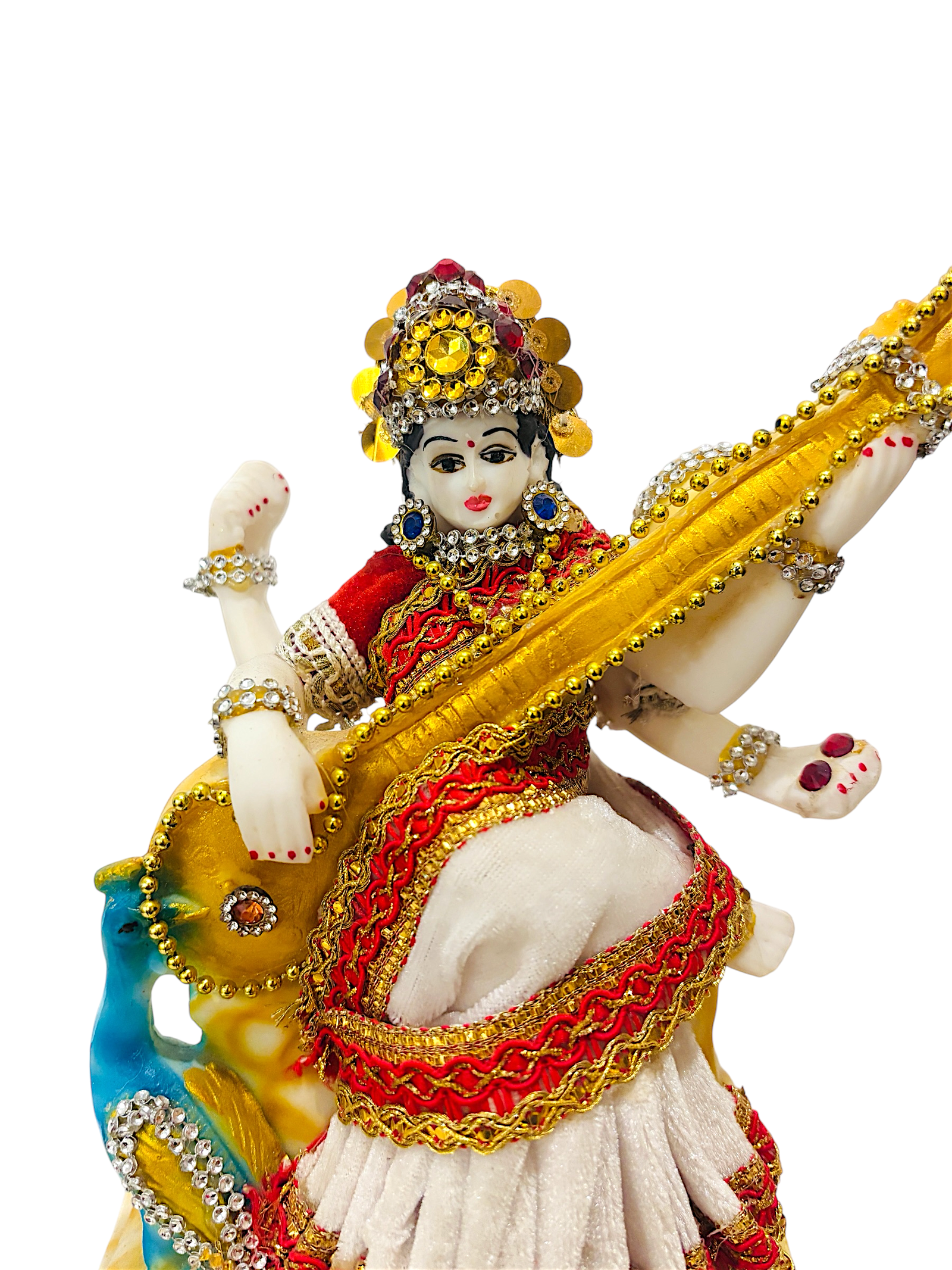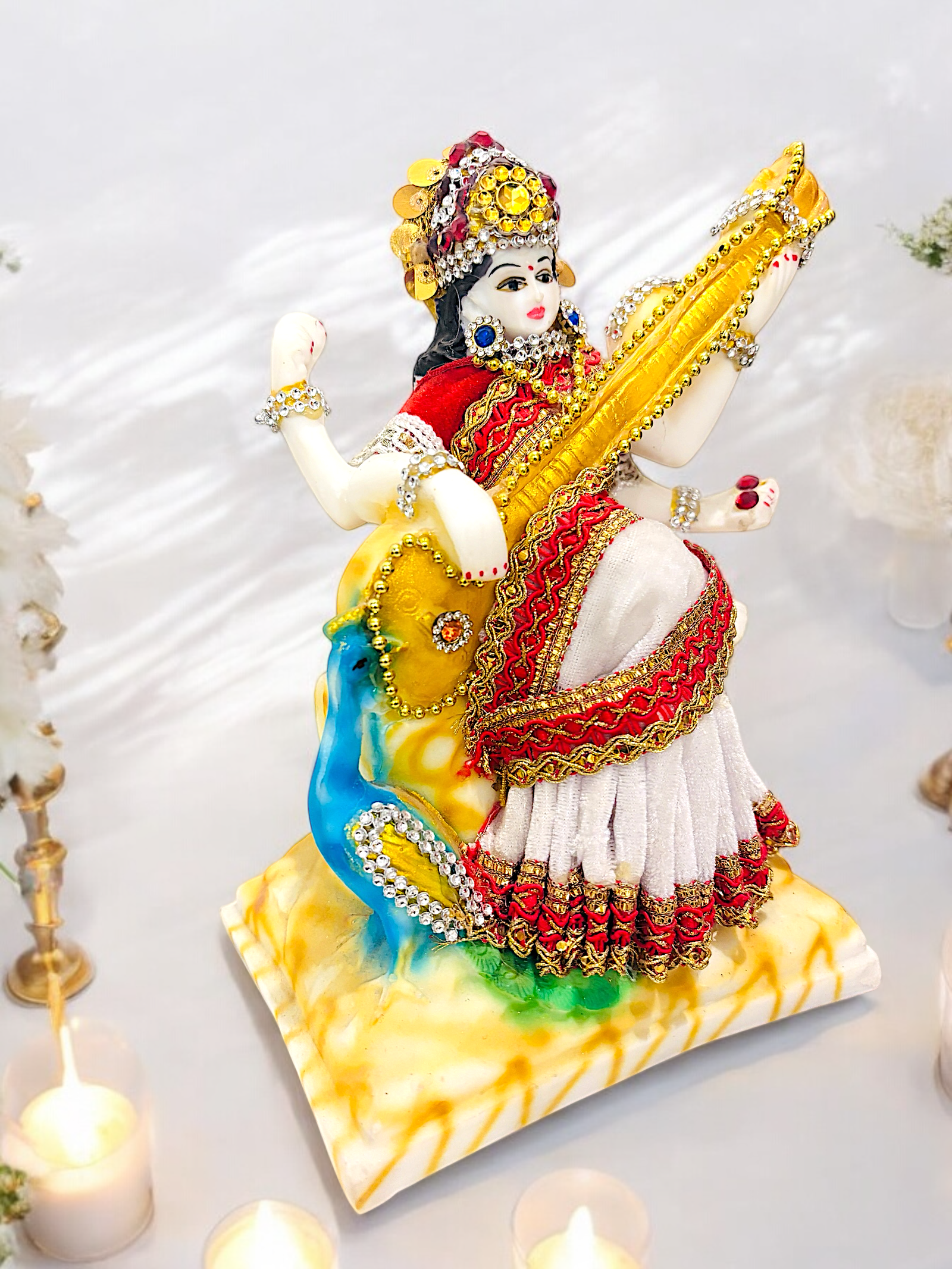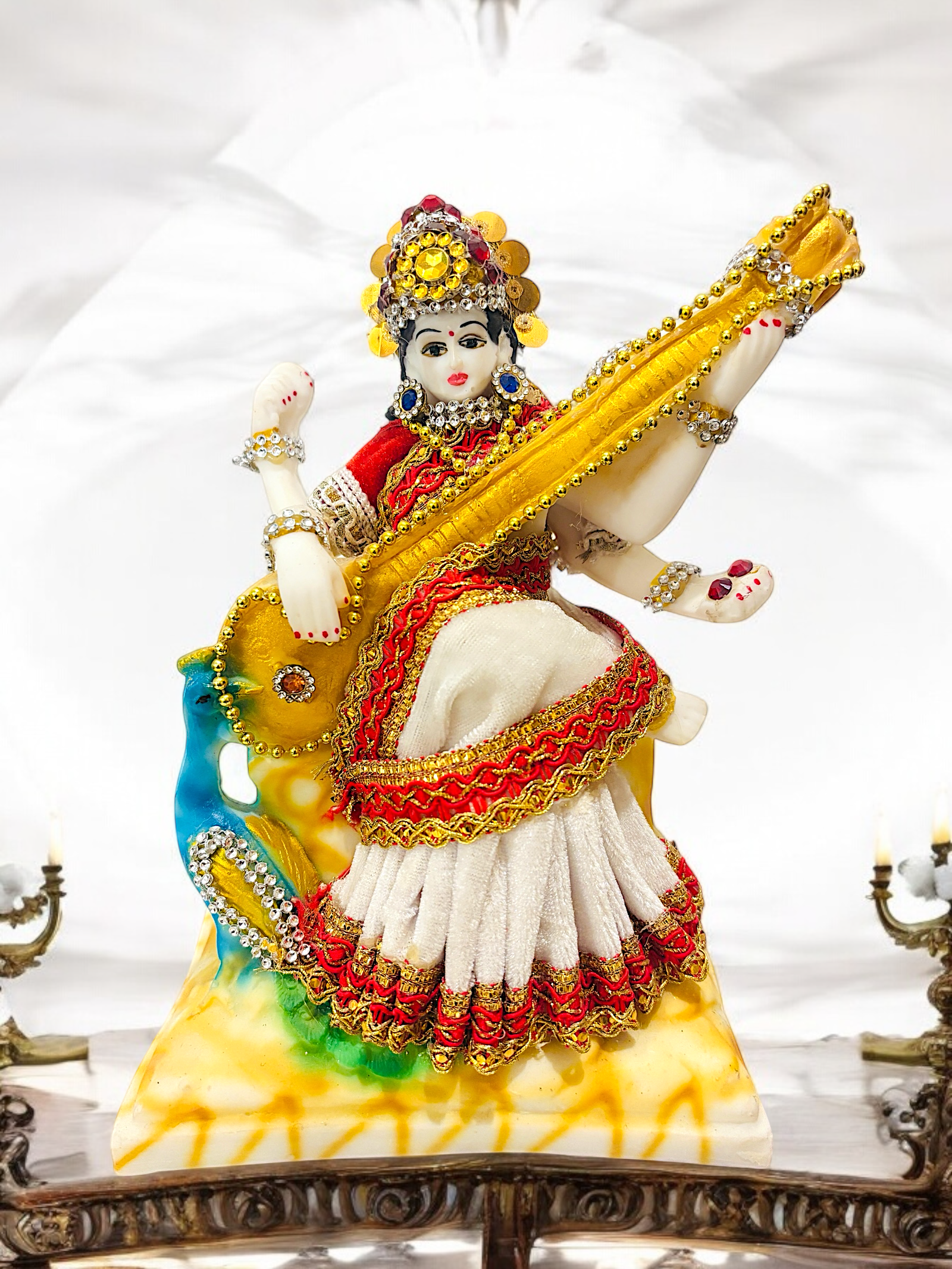 “Saraswati, the goddess of knowledge and arts.She is often depicted with a veena (a musical instrument) and a peacock by her side”