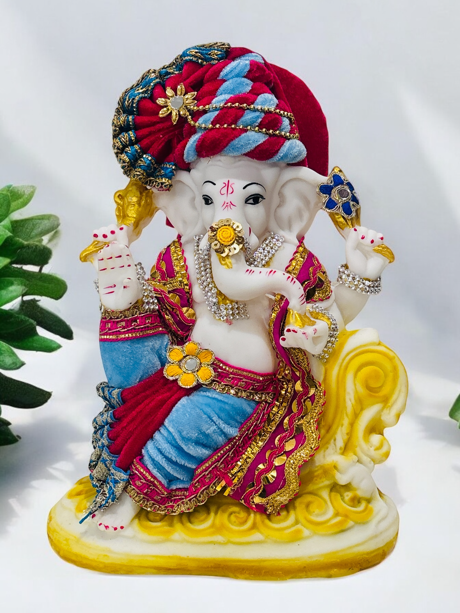 This marble statue depicts Lord Ganesha seated gracefully on a decorative yellow throne.