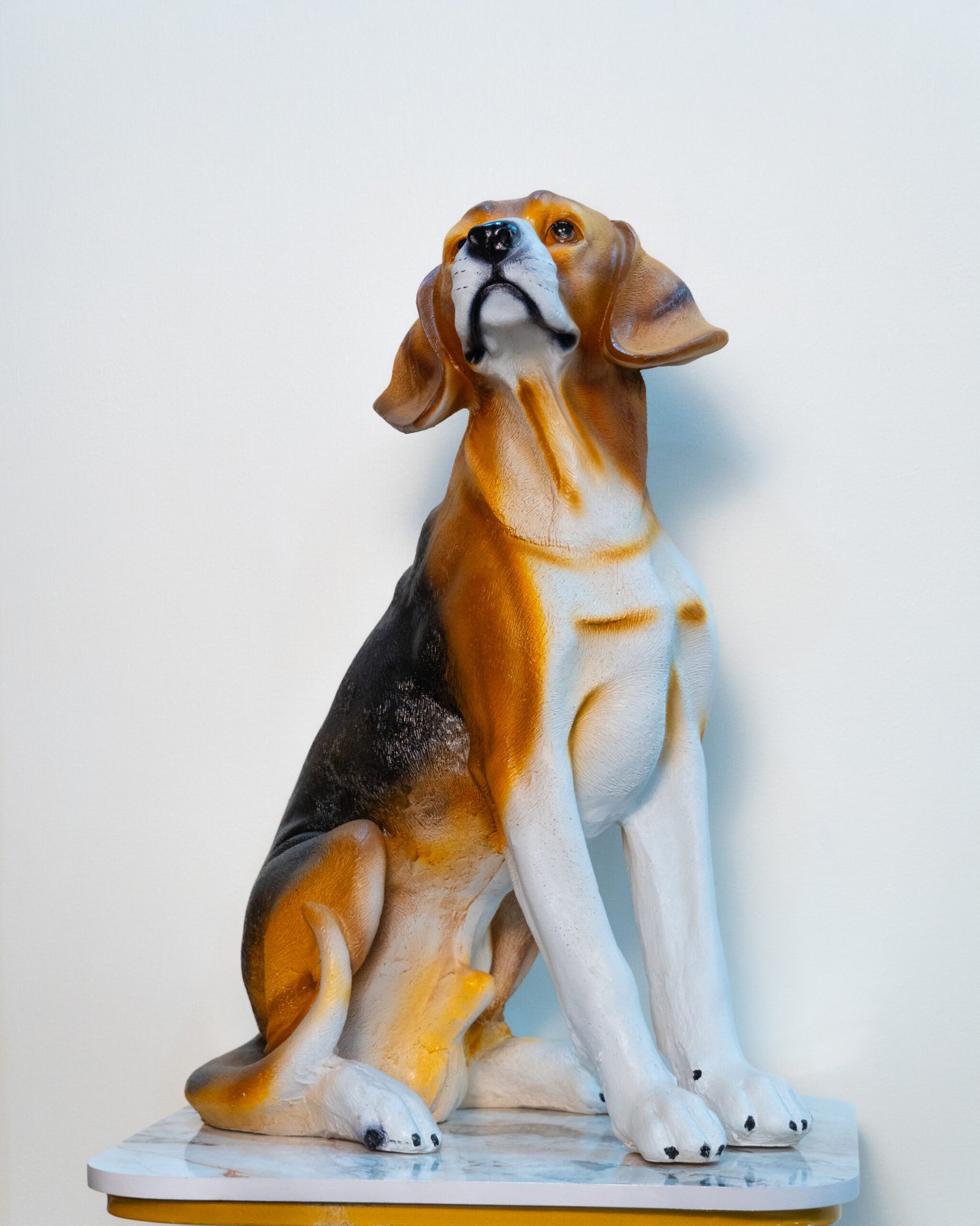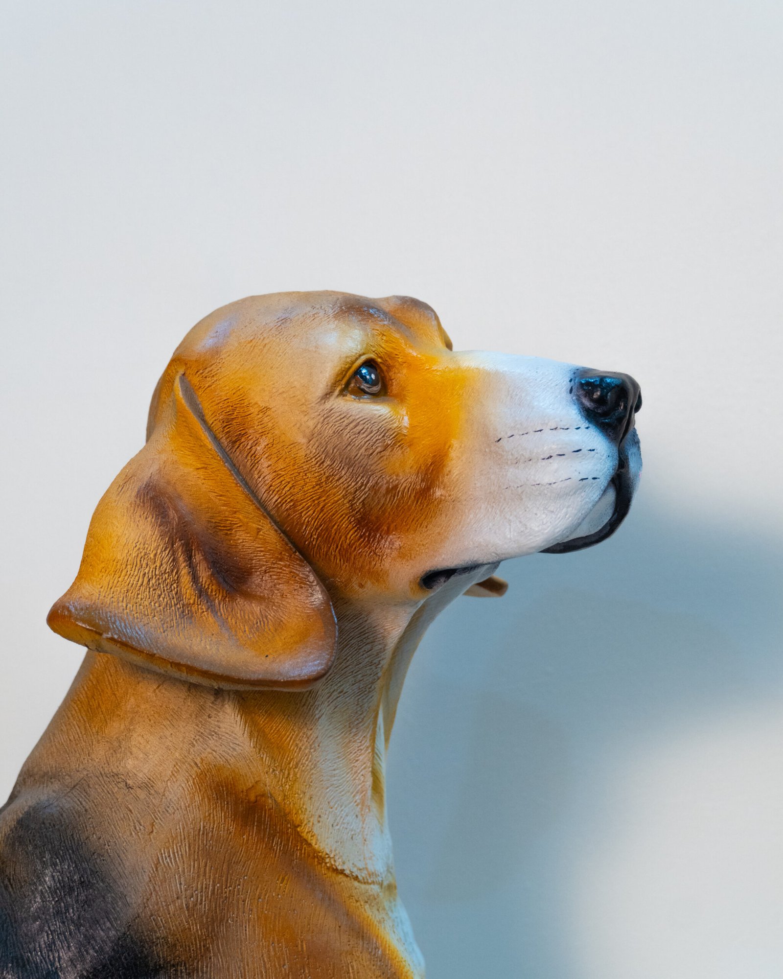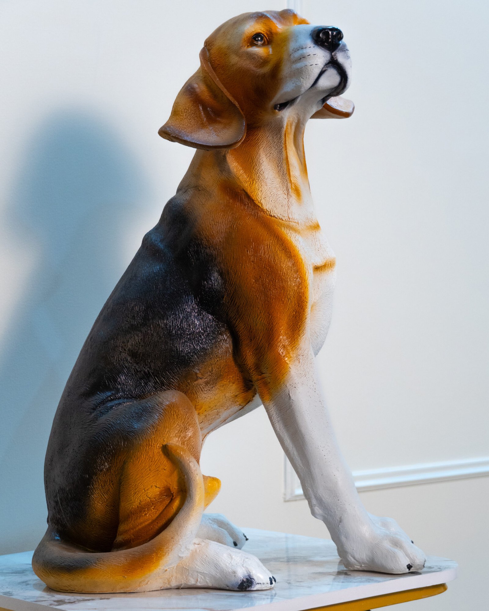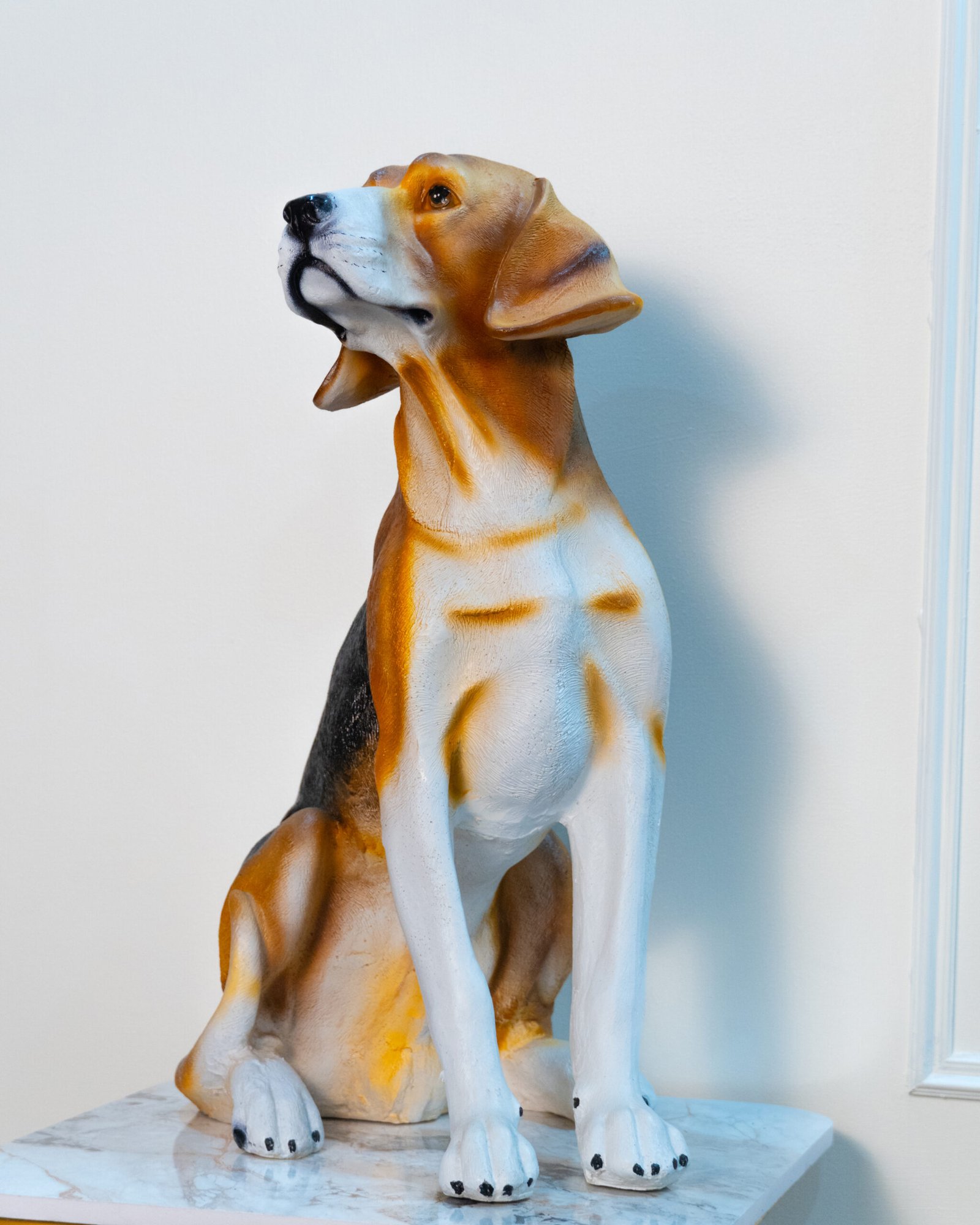 Our Beagle sitting attentively has a tricolour cot with a mix of black, brown and white shade. Looking upwards and showcasing its characteristic large, expressive eyes and long drooping ears.